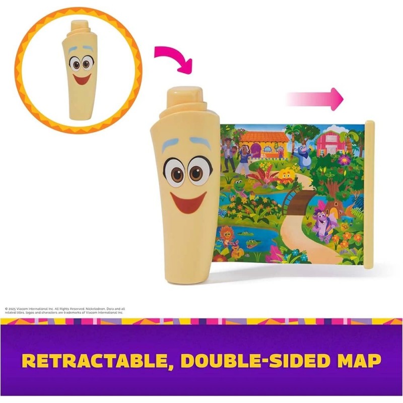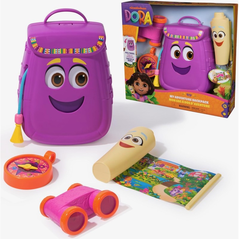 Edad recomendada: +3 años. Mochila de Aventuras de Dora la Exploradora con Accesorios de Exploración. La Mochila de Aventuras de Dora la Exploradora invita a los más pequeños a vivir emocionantes descubrimientos, como en su serie favorita. Este pack incluye una mochila con ojos y boca móviles, acompañada de accesorios de exploración: un mapa desplegable, una brújula y unos prismáticos de juguete. Perfecta para niñas y niños a partir de 3 años, esta mochila estimula la curiosidad, la imaginación y el amor por las aventuras. Ideal para jugar en casa, en el parque o de viaje… ¡con Dora, siempre hay algo nuevo por descubrir!