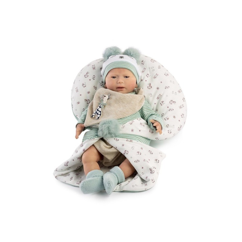 Tiempo de entrega estimado: 10 días. Edad recomendada: +7 años. Pesa 2.2 kg aproximadamente y mide 46 cm. Reborn hiperreal hecho con cuerpo entero de silicona. Es un material seguro y que da una sensación al tacto real.Está hecho de una sola pieza, por lo que sus brazos, piernas y cabeza no se pueden separar. Está pintado a mano, siendo así los detalles como venas, rojeces, uñas, lengua y ombligo le dan un aspecto más real. Sus brazos y piernas tienen movimientos articulados, pero no adoptan posiciones fijas. Belén viste una camiseta verde a rayas marrones con unas braguitas en marrón. Babero a juego con detalle de jirafa. Peucos de lana verde y gorro con pompones a juego. Incluye una suave manta a juego con su ropa. Nuestros bebés reborn de silicona deben manejarse como si fueran bebés reales, ya que tienen el efecto caida,especialmente en su cabeza como un bebé de verdad. Se puede bañar, para ello usar jabón natural. Fabricado en España.