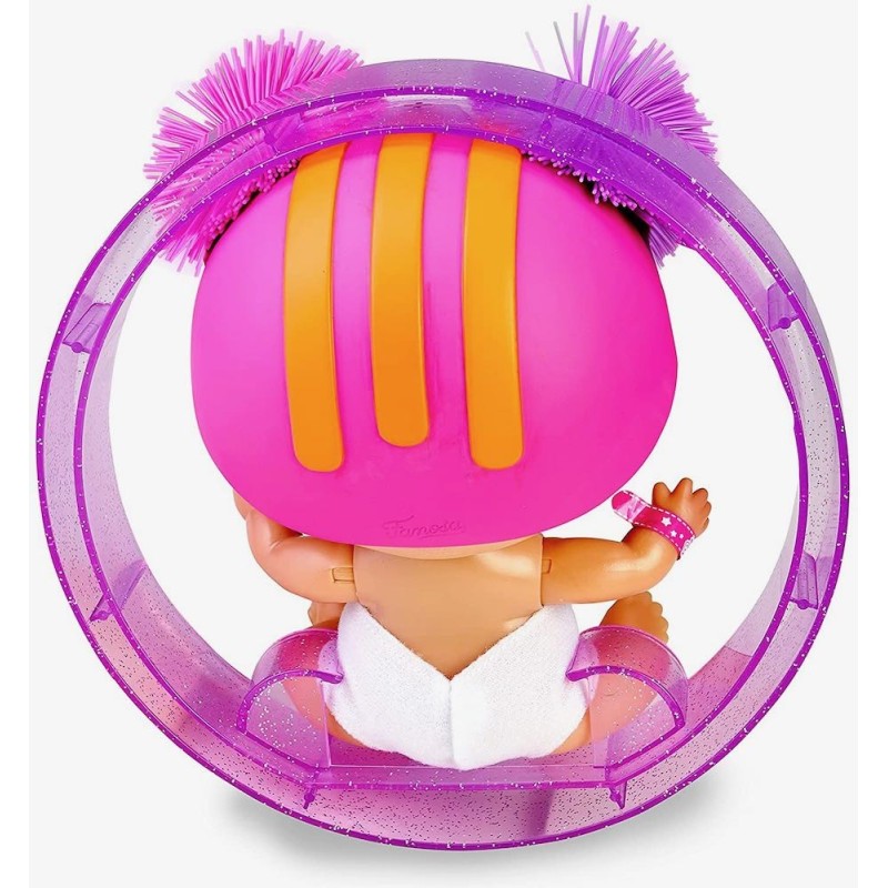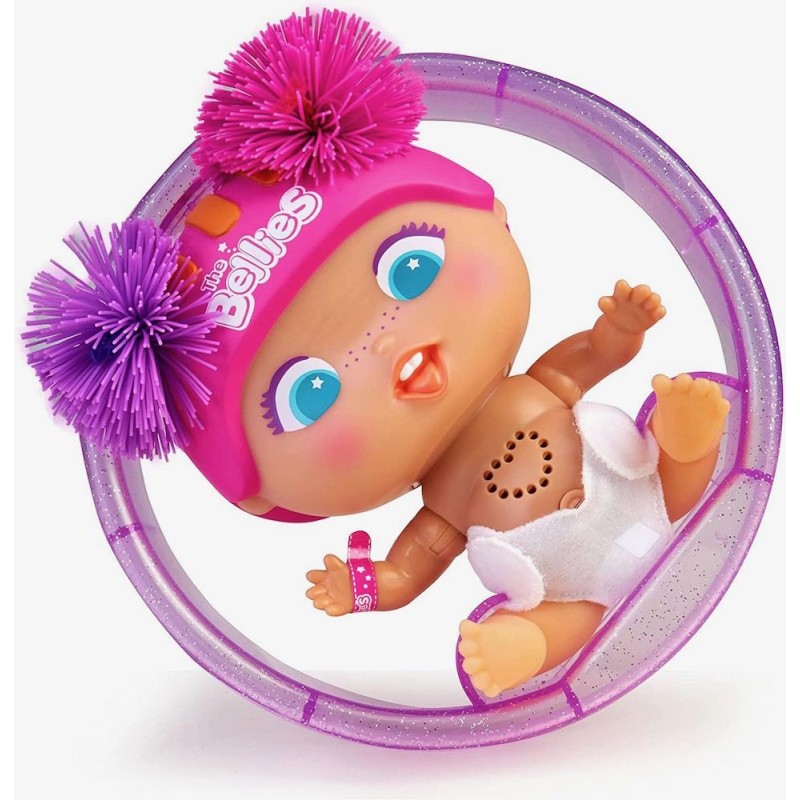 ¡Hula- hoop! Es una Bellie super divertida que incluye un aro morado! ¿Cómo funciona? ¡Solo pon a Hula-hoop! dentro del aro, tíralo y ella rodará y rodará. Hula-hoop! es una Bellie súper mona con un casco rosa y lazos. También puedes sacarla del aro y tiene las mismas características que los otros Bellies; puedes escuchar los latidos de su corazón y hablará de una manera única y divertida, además tiene una bonita marca de nacimiento que se puede encontrar cuando le quitas el pañal. En el pañal también encontrarás una graciosa sorpresa; Visita la Poopypedia en la Bellypedia para descubrir qué cuidados divertidos debes aplicar. Hula-Hoop! es perfecta para seguir coleccionando Bellies y disfrutar de las divertidas y traviesas aventuras de los Bellies. Edad recomendada: +3 años.
