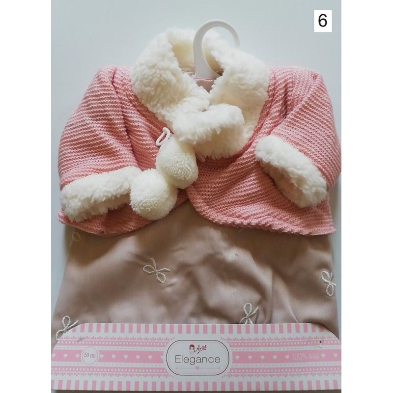 Colección de ropa de la línea Elegance de Arias, para muñecos de 50 cm. Fabricados con bonitos diseños y muy detallados. Las imágenes son orientativas. Modelos surtidos. Se sirven según su disponibilidad. Se venden por separado.