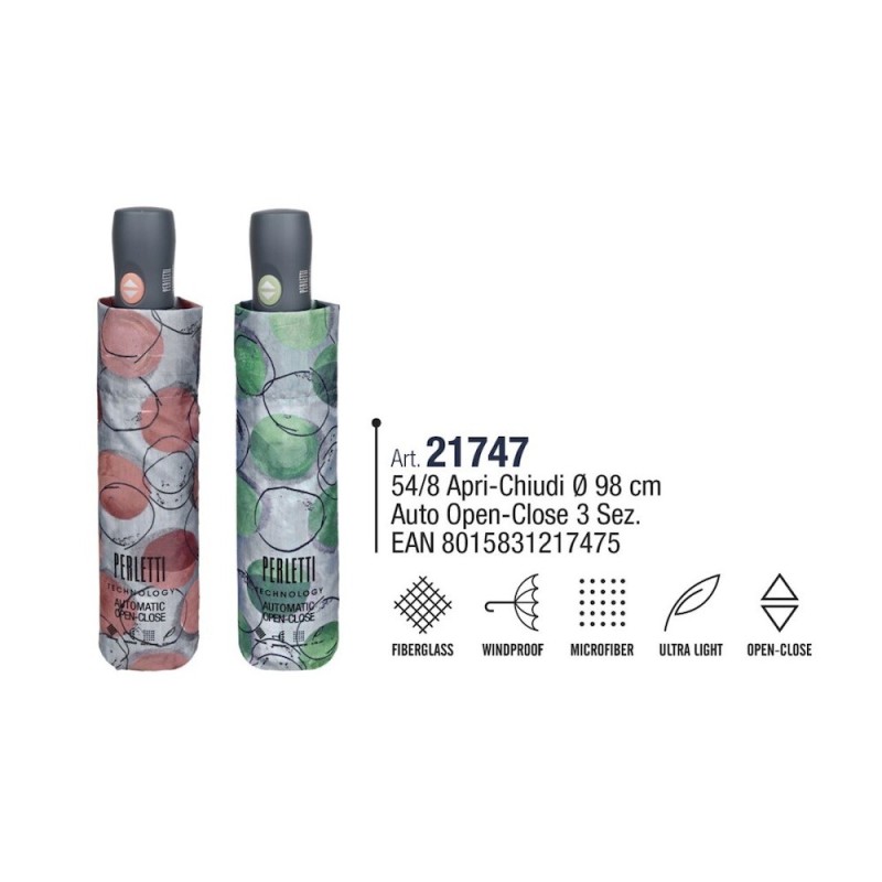 Diámetro: 98 cm. Sistema anti viento. Apertura y cierre automático. Ultraligero.