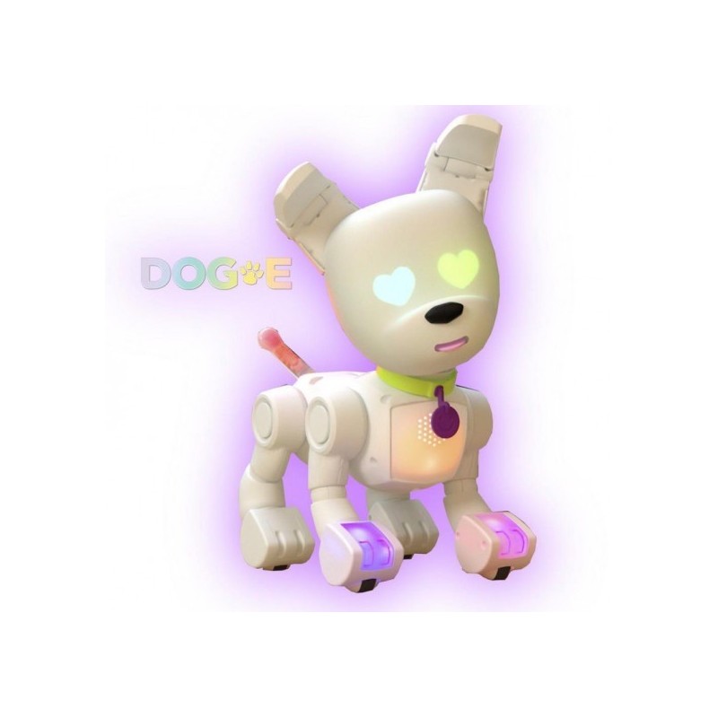 Dog-e, es un perrito robot único en el mercado. Tiene millones de combinaciones de luces que lo hacen diferente, puedes escoger el color de sus ojos, su cola, sus patas, su collar, la forma de sus ojos y el color de su corazón. Dog-e anda y corre como un perro de verdad ¡Puedes enseñarle diferentes trucos! Tiene la capacidad de sentir cuando le tocas, de escuchar tu voz, de mostrar mensajes con su cola y de cambiar las luces de su cuerpo. ¡Hay 4 opciones de ladrido diferentes!, pero esto no es todo ya que también podrás ponerle un nombre y responderá ante él. A través de su app podrás ver sus necesidades, si tiene hambre, si quiere pasear, jugar o dormir. Con esta app también podremos alimentarle, enseñarle los trucos, elegir las luces e incluso crear varios Dog-es con distintos perfiles. Con batería del litio 3,7 V. Edad recomendada: +3 años.