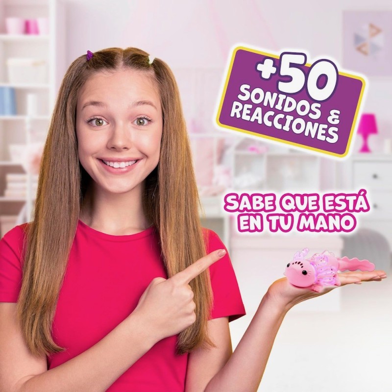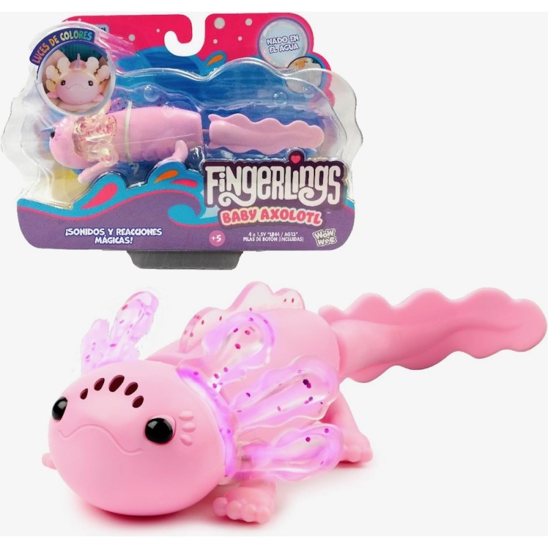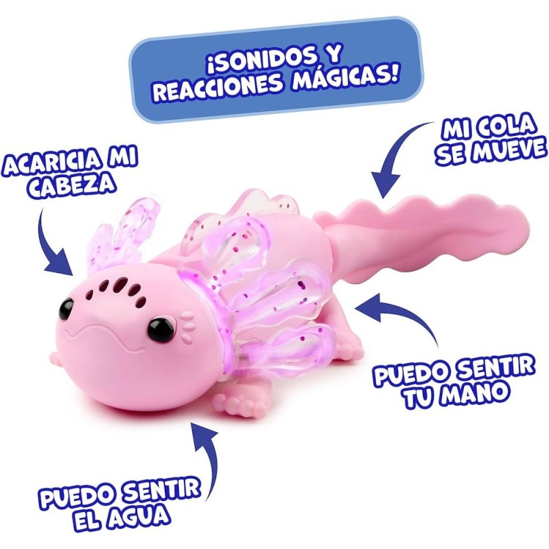 Edad recomendada: +5 años. ¡Llega Fingerlings Axolot, tu ajolote interactivo! Será tu mejor amigo, con más de 50 sonidos y reacciones mágicas. ¿Cómo estás hoy? ¡Adivina tu estado de ánimo! Sabe cuándo está en tu mano y cuándo le acaricias la cabeza, pero además… ¡¡nada de verdad!! Detecta cuándo está en el agua, se ilumina y nada por el agua como un verdadero ajolote.
