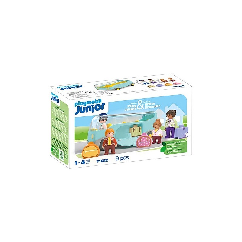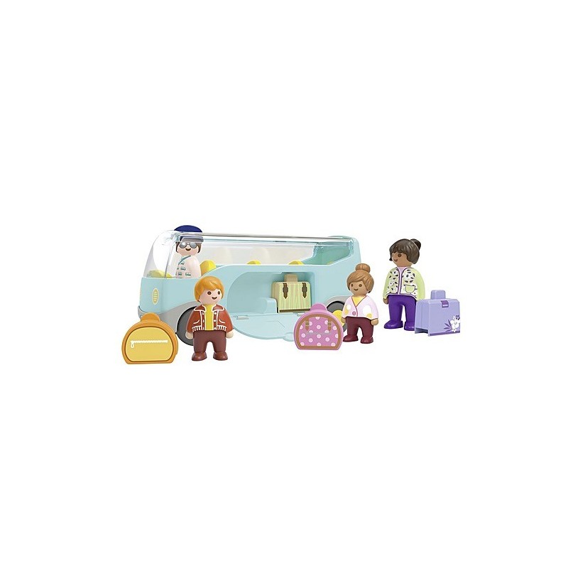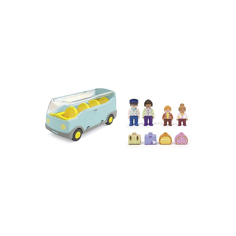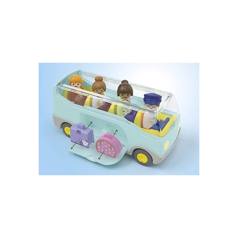 Incluye 4 figuras. El autobús dispone de compartimento para guardar las maletas. Características especiales del producto: - Autobús con cuatro asientos, enganche para remolque y dos maleteros para ordenar las formas - Figuras de juego con maletas y bolsas de colores coordinados.