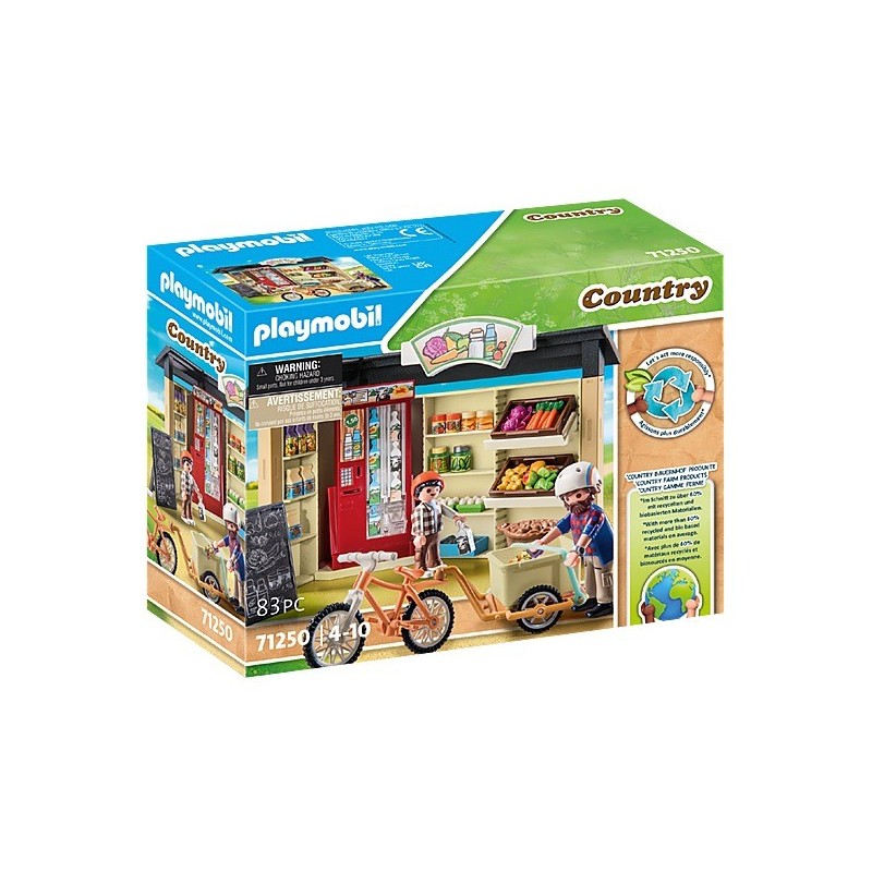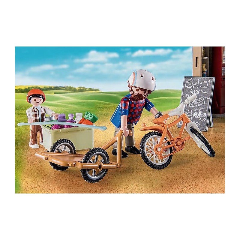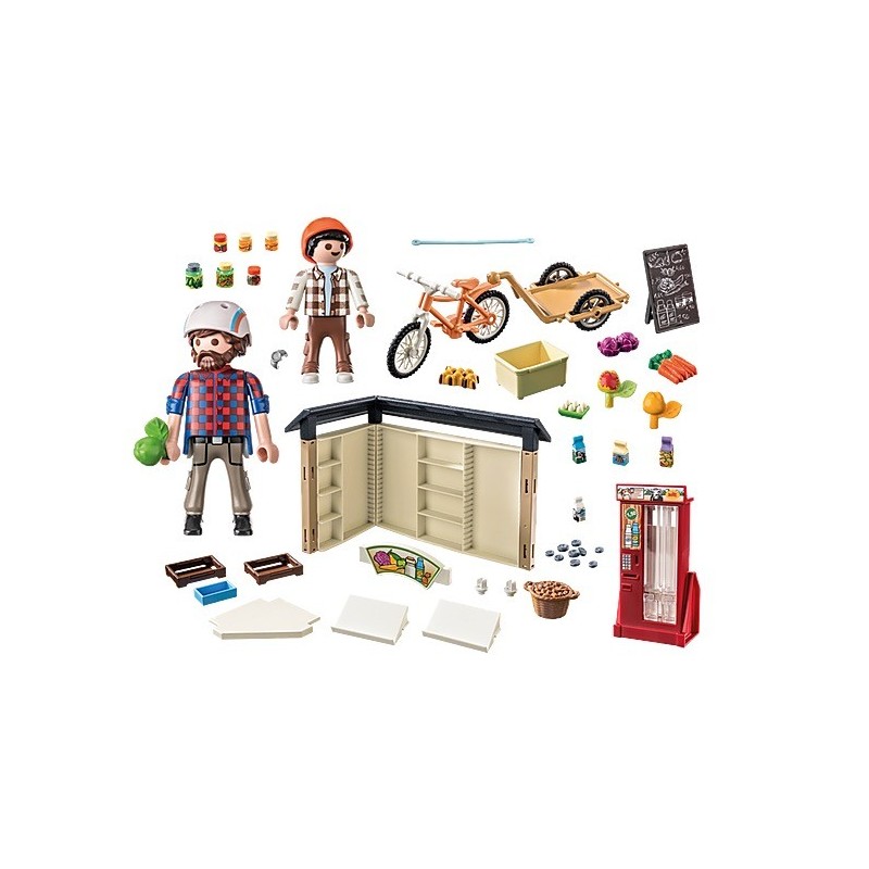 Hay mucho espacio para todos los productos frescos en la tienda agrícola de autoservicio abierta las 24 horas. Las botellas se pueden comprar en el dispensador de botellas. Los productos comprados en la tienda de la granja se pueden almacenar en el remolque de bicicletas. Frescos, de proximidad y preferiblemente ecológicos: así deberían ser todos los alimentos. En la tienda de la granja, los clientes pueden comprar fruta fresca, verduras, productos lácteos y bebidas las 24 horas del día y a precios justos. El agricultor cosecha las verduras recién sacadas del campo y las lleva directamente a la tienda desde la granja. En las estanterías, los alimentos pueden estar perfectamente ordenados y bien presentados. Especificaciones: - El set de juguetes PLAYMOBIL de 83 piezas incluye dos figuras PLAYMOBIL, una tienda de granja con máquina expendedora de leche, huevos, frutas, verduras y varios otros artículos de alimentación. - El mundo de la granja PLAYMOBIL inspira el juego de rol imaginativo con detalles auténticos y ayuda a desarrollar importantes habilidades y confianza en sí mismos. - Bueno para el medio ambiente: Todos los nuevos juegos del mundo de la granja PLAYMOBIL están fabricados con más de un 80% de materiales sostenibles.
