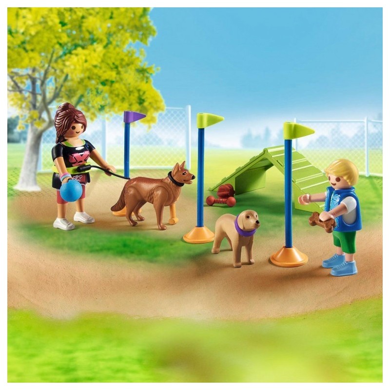 La zona de juegos para perros ofrece a los perros y a sus dueños muchas formas diferentes de jugar: desde carruseles para perros hasta pistas de eslalon. Incluso un perro con una prótesis en la pata puede jugar aquí a sus anchas. ¡Emoción en el parque para perros de PLAYMOBIL! Gira en el carrusel, corre en el slalom o chapotea en la piscina de bolas: diversión sin fin para los perros y sus dueños. Con un perro pastor con una pata protésica móvil, este producto celebra la inclusión y el juego imaginativo. Personaliza el recorrido con barreras de silicona, lanza juguetes o monta la rampa para vivir aventuras llenas de energía. La correa se engancha al cinturón de la figura para tener las manos libres.