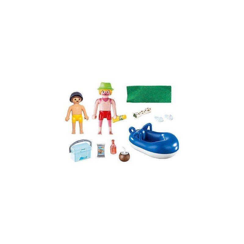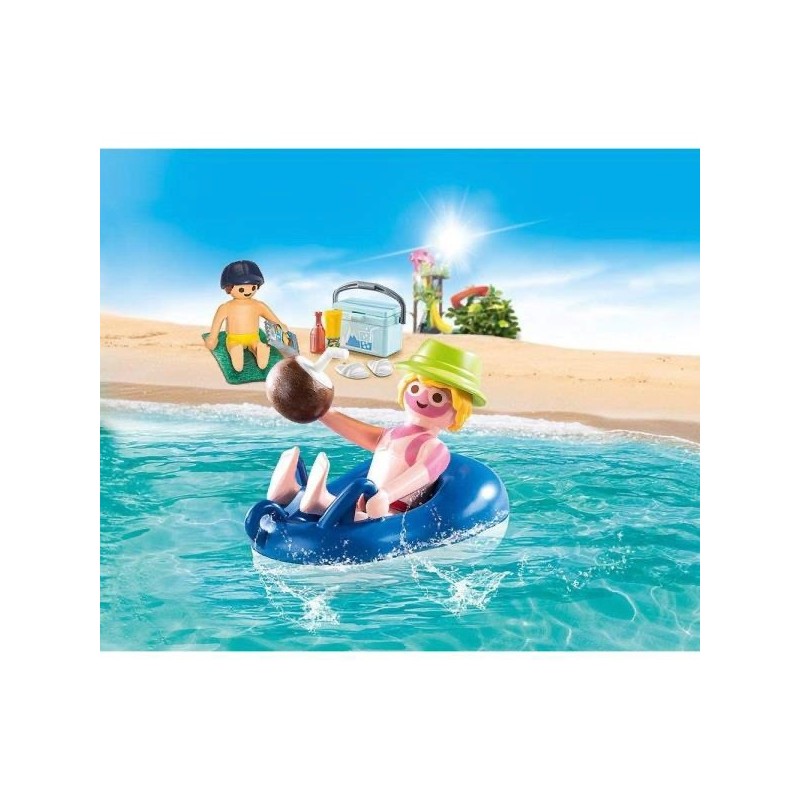 PLAYMOBIL 70112, Nadador con Flotador La exposición a la luz UV hace que el color de la piel de la figura se vuelva parcialmente rojo. El neumático flota. Chapotear en el agua con el flotador es muy divertido. Pero si te olvidas de la protección solar, te espera una desagradable sorpresa al final del día: ¡quemaduras solares! La piel del nadador no sólo está roja, sino que además arde como un demonio. Es el momento de descansar de sol y aplicar una pomada curativa. Afortunadamente, la piel tiene mucho mejor aspecto al día siguiente. A partir de ahora, ¡nunca más se olvidará de aplicar la protección solar! El set contiene dos figuras PLAYMOBIL, un flotador, una nevera, una toalla, zapatillas de baño y otros estupendos extras. Partes de la piel de la figura adulta se vuelven rojas cuando se exponen a la luz UV