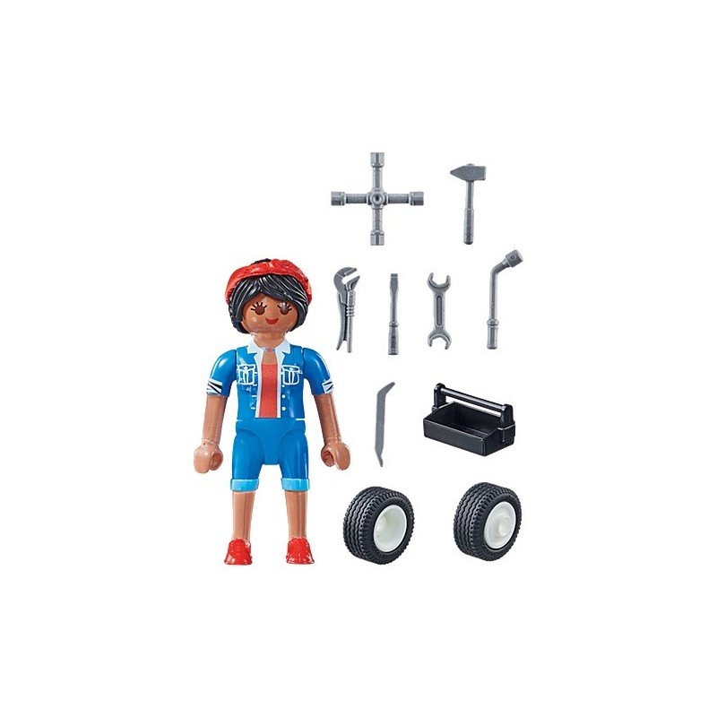 PLAYMOBIL Special Plus Mecánica con herramientas y neumáticos. Ponte a trabajar con el mecánico de PLAYMOBIL. Antes de poder cambiar las ruedas, primero hay que colocar los neumáticos en las llantas. Por supuesto, cada movimiento debe ser medido para ser un mecánico experimentado. Luego utiliza la cruz del carro para montar las ruedas. Un gran set de juego para los pequeños mecánicos aficionados. El Set Especial Plus incluye una figura PLAYMOBIL, dos neumáticos, una caja de herramientas y un juego de herramientas. Las herramientas se pueden guardar en la caja de herramientas. Las figuras PLAYMOBIL Special Plus ofrecen una gran diversión de juego con muchos accesorios a partir de 4 años. Se puede jugar solo con las figuras de forma individual o combinadas con otras gamas de PLAYMOBIL.