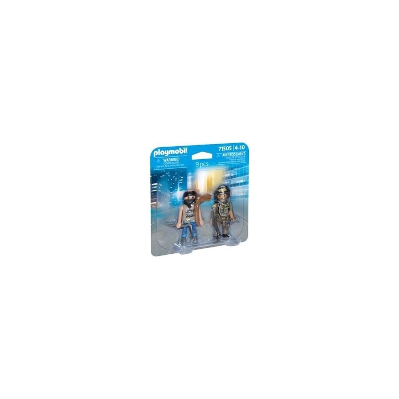 Más diversión con los DuoPacks de PLAYMOBIL. Dos figuras con accesorios ofrecen muchas horas de juego. Este DuoPack incluye a un oficial de policía SWAT con un casco y a un bandido con una máscara y esposas. Los DuoPacks de PLAYMOBIL son una sorpresa ideal o un pequeño regalo para niños y niñas creativos de 4 años.