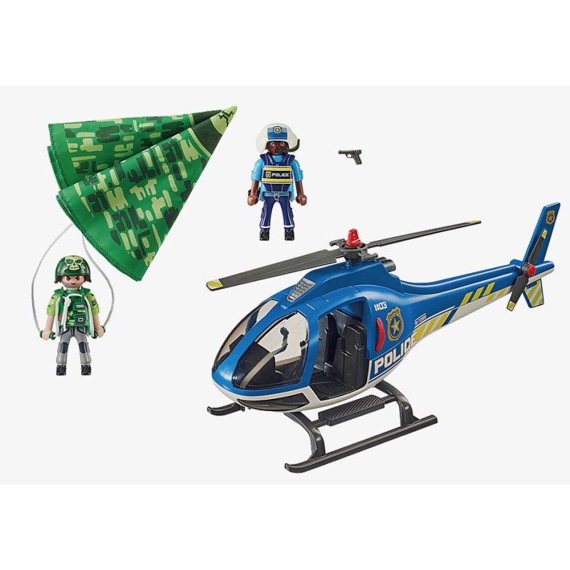 Helicóptero de Policía: persecución en paracaídas. Operación policial de gran envergadura. El ladrón quiere escapar con paracaídas. Mientras el ladrón se desliza lentamente hacia el suelo, el policía, desde la cabina del helicóptero, lo vigila. Cuando aterriza, ya lo está esperando. El siguiente viaje será la cárcel. El set contiene dos figuras de PLAYMOBIL policía y ladrón, un helicóptero policial, un paracaídas y muchos otros extras para emocionantes persecuciones aéreas. Lanza el paracaídas y la figura al aire y mira cómo flota en el suelo. Edad recomendada: +4 años.