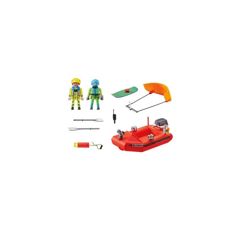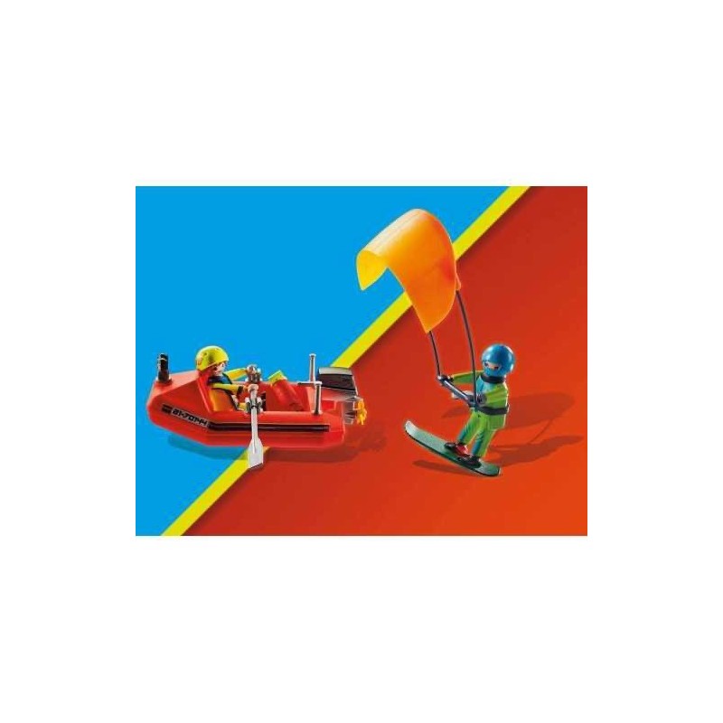 El rescatador lanza una bolsa de rescate al náufrago y lo sube al barco. El kitesurf es divertido, pero a veces puede ser peligroso. El kitesurfer ha sido golpeado por una ola y tirado de su tabla. Afortunadamente, el socorrista con su bote no está lejos y corre rápido para ayudar. Rápidamente le lanza el equipo de rescate y puede subir a bordo en un santiamén. ¡Todo ha salido genial. El set de juego contiene dos figuras PLAYMOBIL, un bote, una tabla de wake con cometa, un equipo de rescate que se lanza y muchos otros extras. El bote tiene espacio para una persona y se le puede añadir un motor submarino (no incluido). Edad recomendada: +4 años.