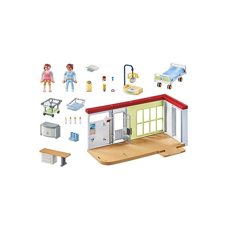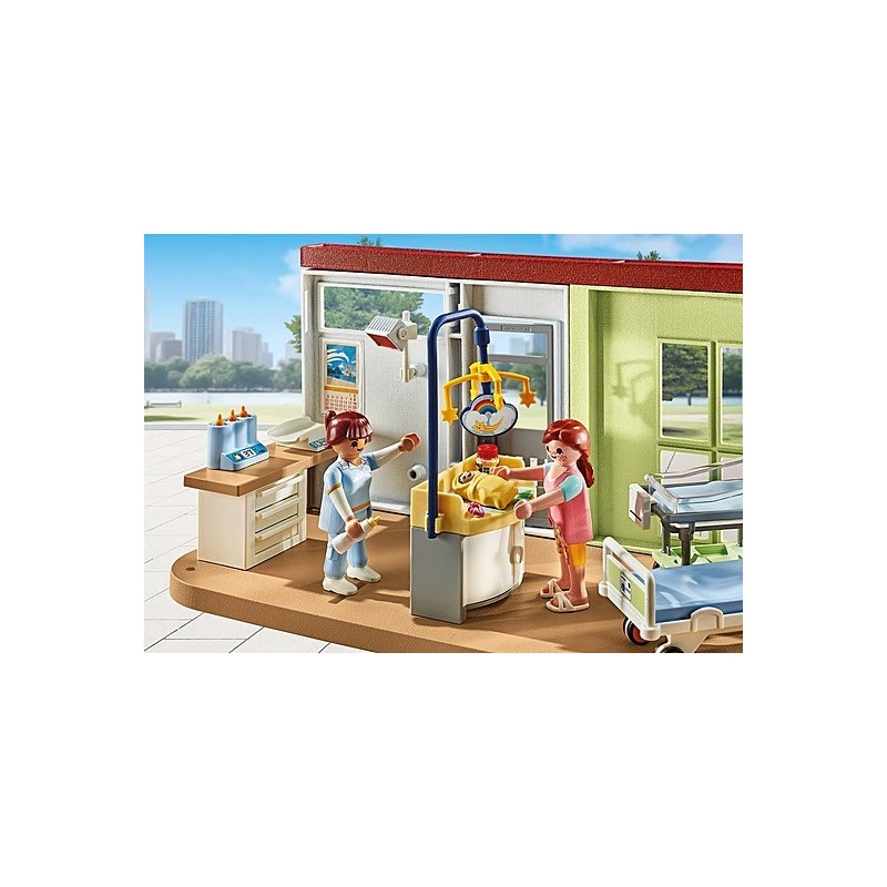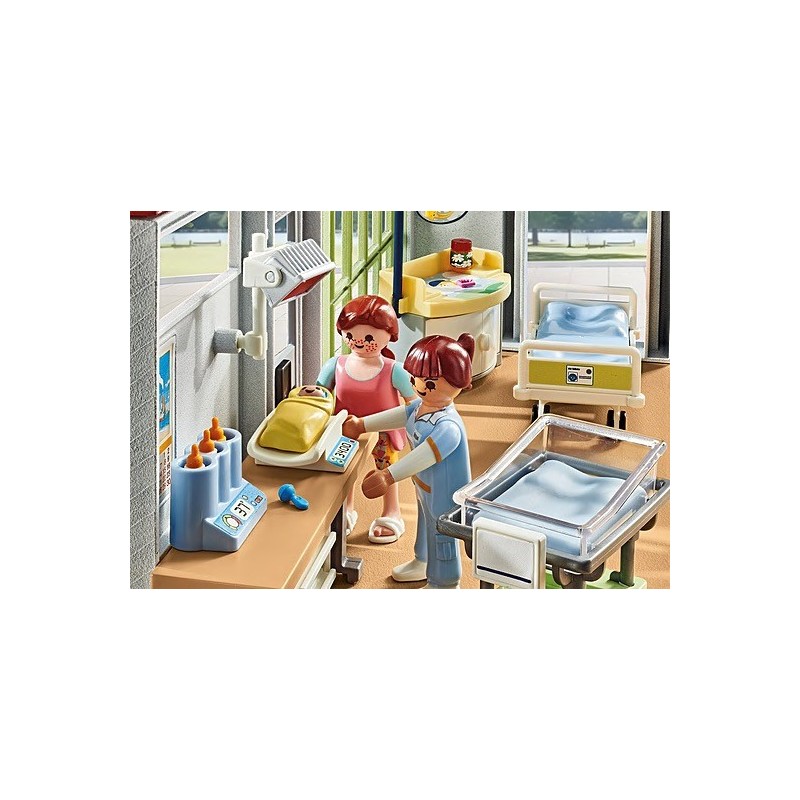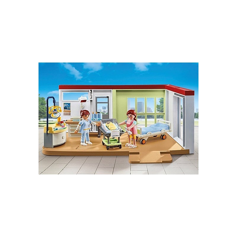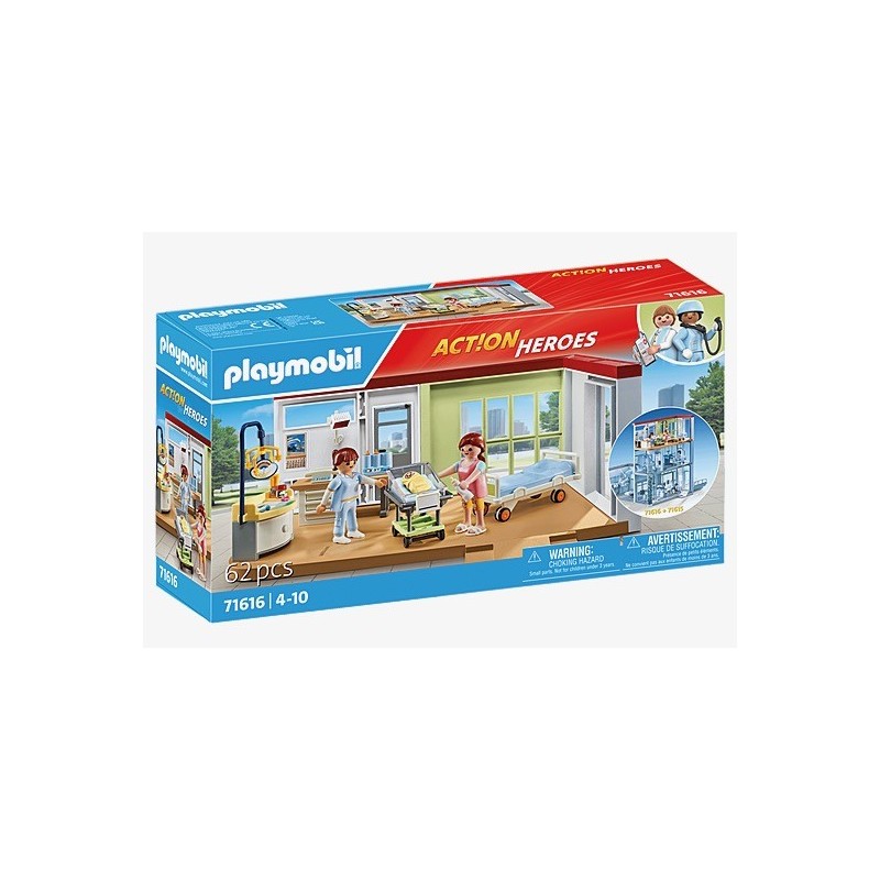 Comienza la vida en la sala de Maternidad PLAYMOBIL que incluye tres figuras PLAYMOBIL, cambiador, lámpara de calentamiento y muchos accesorios realistas. En la sala de Maternidad se cuida mucho del bienestar de las madres y sus hijos e hijas. El nombre del miembro más joven de la familia puede escribirse en el cartel de la cuna del bebé, y hay una báscula disponible para comprobar su peso. Este set puede acoplarse modularmente al Hospital Moderno (71615). El Mundo Hospitalario de los Héroes de Acción PLAYMOBIL invita a niñas y niños a aprender sobre la vida en un Hospital Moderno y a jugar con temas como los cuidados, el tratamiento y la enfermedad. El set de juguetes de 62 piezas incluye 3 figuras PLAYMOBIL, una cama de hospital, un cambiador y muchos otros extras para un juego de rol imaginativo.