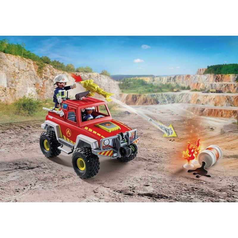 ¿Terreno accidentado? Ningún problema para el camión de bomberos, que llega al lugar del accidente donde una lata de aceite se ha derramado. El camión de bomberos con espacio para dos figuras incluye cabrestante de cable, cañón de agua con función de disparo, techo desmontable y zona de carga para el equipo. Las manchas de aceite de silicona se adhieren a superficies lisas y se pueden volver a quitar. ¡Corre al rescate con el Camión de bomberos de PLAYMOBIL! Diseñado para las misiones más difíciles. Este camión de bomberos está repleto de emocionantes características como el techo que es desmontable permitiendo sentar a dos bomberos en su interior. Las viseras plegables del casco, los accesorios desmontables y la tapa extraíble del bidón de aceite permiten un sinfín de posibilidades para contar historias. Da vida a aventuras de bomberos llenas de acción con este detallado producto de PLAYMOBIL.