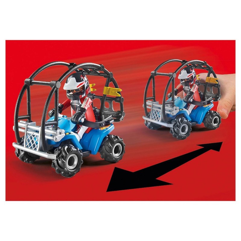 Starter Pack Stuntshow Quad con Rampa de Fuego. ¡Pura adrenalina con PLAYMOBIL! Este piloto de acrobacias lleva gasolina en la sangre. Con valentía dirige su quad hacia la rampa en llamas. Los espectadores contienen la respiración. El cuadriciclo sale de la rampa, rueda y aterriza de nuevo con seguridad sobre sus neumáticos. El conductor saluda despreocupadamente desde el vehículo. Los espectadores aplauden a rabiar. El quad tiene un motor de retroceso. Los paquetes de inicio PLAYMOBIL son una introducción ideal al gran y colorido mundo PLAYMOBIL. El set incluye un quad con rampa de incendios, dos figuras y extras, se monta rápidamente y está listo para jugar inmediatamente. Gracias a los accesorios adecuados a la edad, los Starter Packs son ideales para niños a partir de cuatro años.