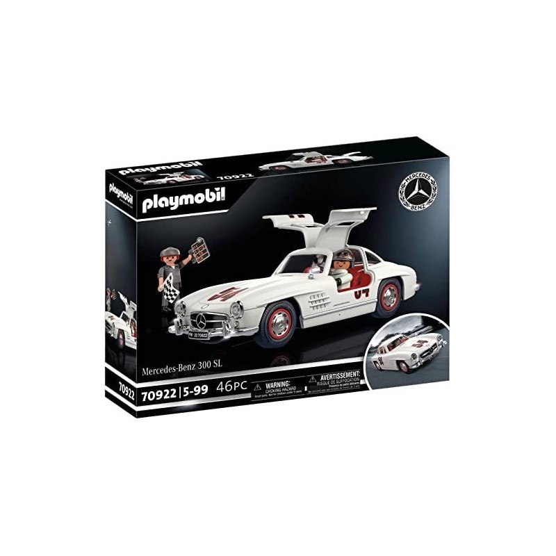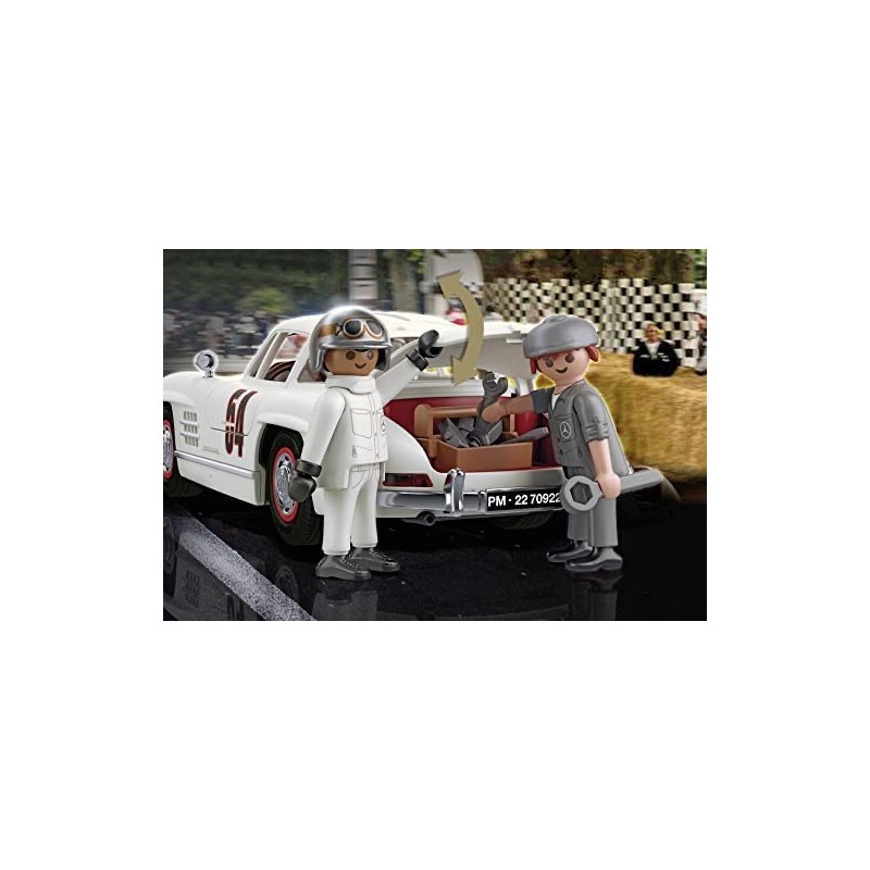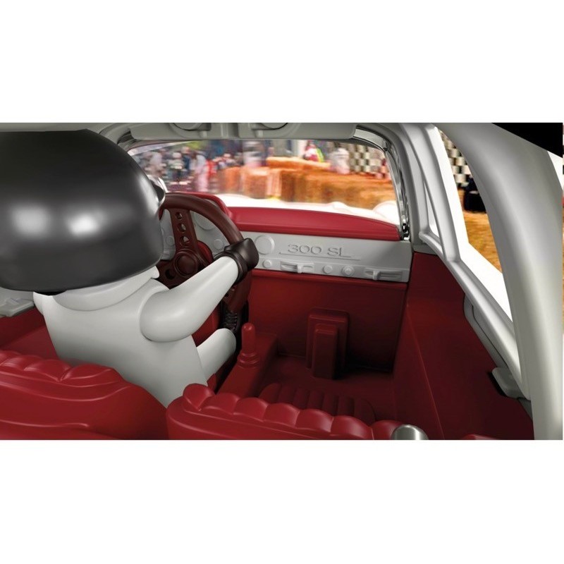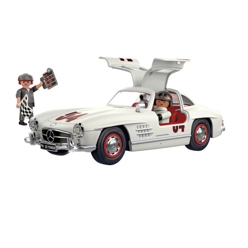 El icono de los coches deportivos de los años 50 con las legendarias puertas de alas de gaviota. Ahora también de PLAYMOBIL, equipado con figuras y accesorios en una escena de carreras de los años 50.