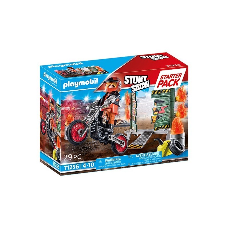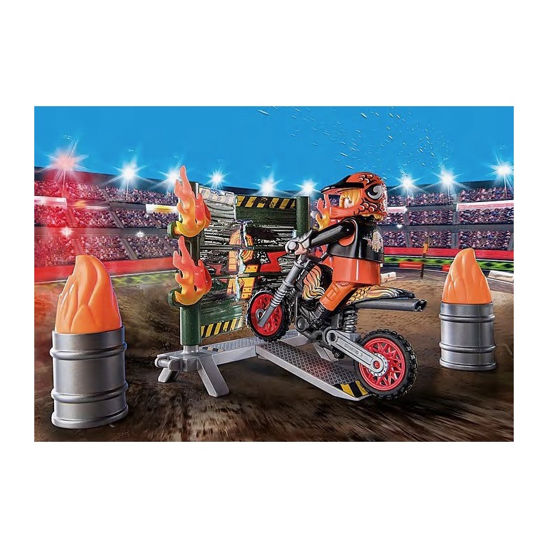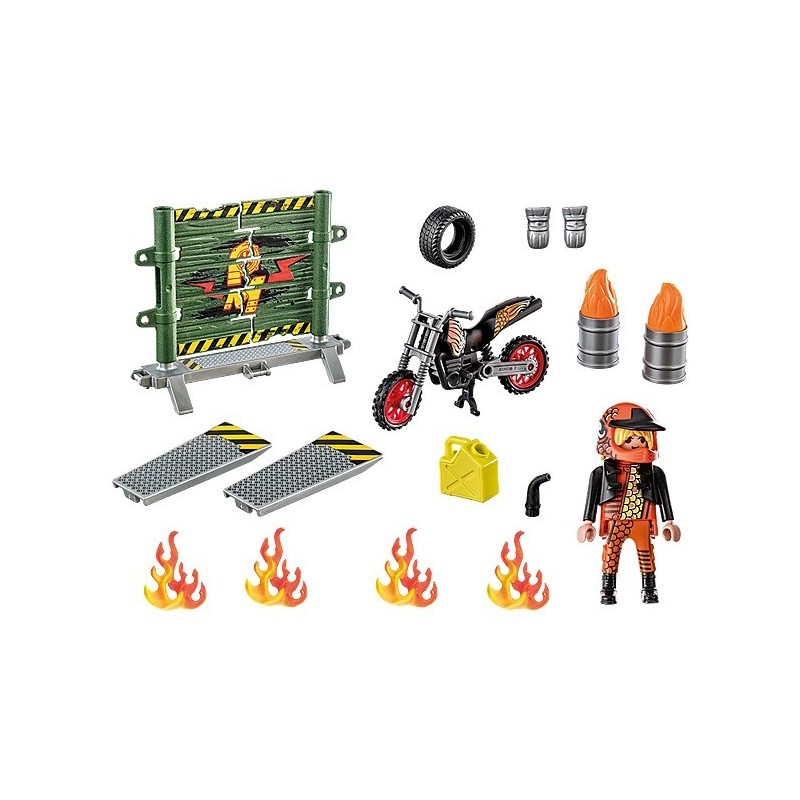 Starter Pack Stuntshow Moto con pared de fuego para realizar acrobacias. Practica atrevidos trucos y grandes acrobacias con el Starter Pack Stuntshow de PLAYMOBIL. Este acróbata no teme a nada y es capaz de conducir su motocicleta a través del muro de fuego en llamas. Para protegerse lleva guantes y casco. Permanece atento para ver la siguiente acrobacia. Un emocionante set de juego para los aficionados a las acrobacias a partir de 4 años. El set incluye una figura PLAYMOBIL, una moto, guantes, bidones, neumáticos, un muro de fuego con rampa y otros accesorios para un emocionante juego de rol. Los Starter Packs de PLAYMOBIL son la introducción ideal al universo PLAYMOBIL. Los sets contienen figuras de juego y accesorios para los diferentes mundos de PLAYMOBIL, son rápidos de montar y están listos para jugar de inmediato.