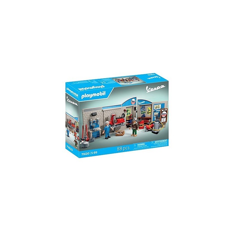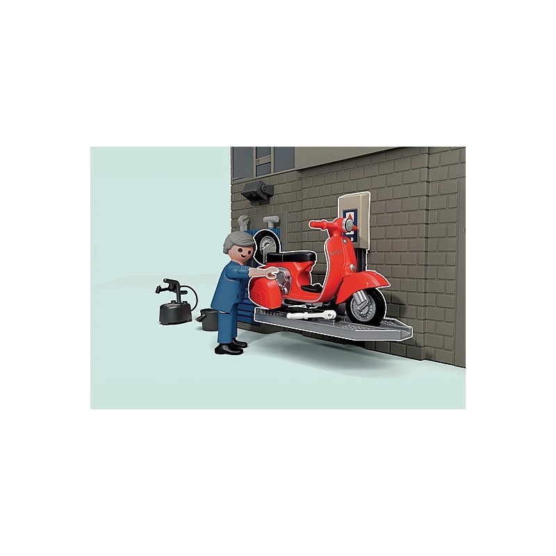 El Garaje Vespa está perfectamente equipado con muchos accesorios. La plataforma elevadora es móvil y ofrece espacio para una Vespa. Las ruedas de la Vespa pueden desmontarse para simular un cambio de ruedas. Las variantes de sillín permiten cambiar el estilo de la Vespa. ¡Bienvenido al Garaje Vespa de los años 60 de PLAYMOBIL! Este detallado taller es el sueño de todos los aficionados y aficionadas a la Vespa. El cartel giratorio de la puerta indica si el taller está abierto. Equipado con un elevador móvil y muchos estantes para botellas de aceite, herramientas y piezas de repuesto, ofrece espacio suficiente para reparar tu Vespa favorita. Con los accesorios incluidos y gracias a las ruedas desmontables, se puede simular un cambio de neumáticos. Pero eso no es todo - las diferentes variantes de sillín te permiten personalizar la Vespa según tu propio estilo con un sillín original o con un asiento para una figura PLAYMOBIL. Tanto si eres un mecánico experimentado o simplemente un fan entusiasta, ¡este Taller Vespa de los años 60 de PLAYMOBIL es perfecto para emocionantes juegos de rol o como una adición a la colección de coches! Un gran regalo o recuerdo para los entusiastas de los vehículos de 5 a 99 años. Contenido: Figuras: 1 mecánico, 1 cliente; Animales: ninguno; Accesorios: 1 Vespa, 1 pared de garaje en 2 partes, 1 plataforma elevadora, 1 bomba de mezcla de dos tiempos, 1 compresor con pistola pulverizadora, 1 bidón de aceite, 1 taladro vertical, 1 manómetro de aire, 1 caja de herramientas con herramientas, 1 escoba, 1 recogedor, 1 escoba pequeña, 1 fregona, 1 cubo, 1 bidón de aceite, 1 embudo, 2 ruedas de repuesto, 2 sillines Vespa beige, 2 sillines Vespa negro, 2 botellas de aceite, 1 bandera decorativa, 1 cartel publicitario, 1 casco.