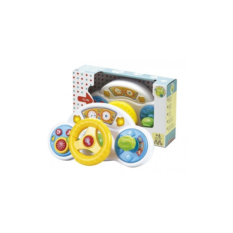 Edad recomendada: +6 meses. Volante de juguete con sonidos diferentes que recrean los de un coche y músicas divertidas. Incluye luces y botones. Funciona con pilas incluidas. Pensado para estimular al bebe.