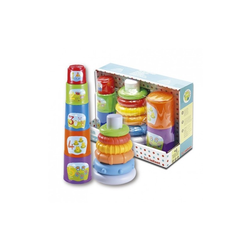 Edad recomendada: +6 meses. Set compuesto de cubos apilables y aros de colores con diferentes tamaños para encajar. Funciona sin pilas. Pensado para la estimulación mortiz del niño.