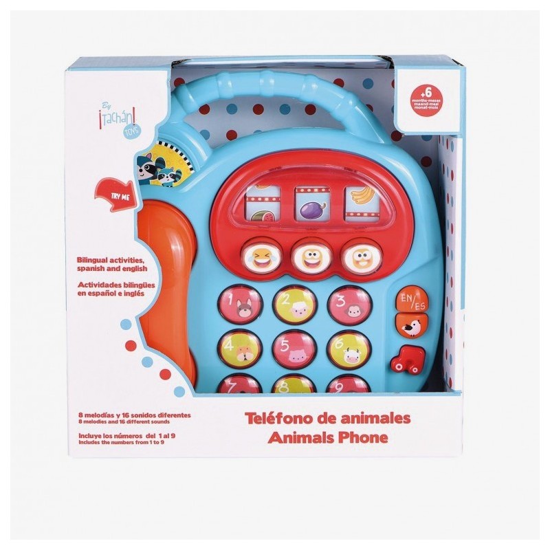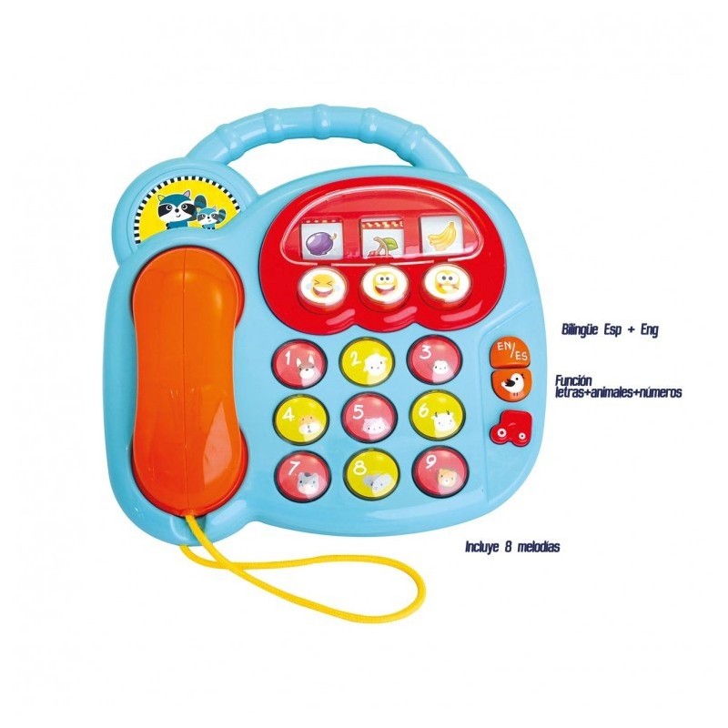 Edad recomendada: +6 meses. Teléfono de juguete con actividades y sonidos. Este teléfono es bilingüe en Castellano y en inglés, lo que lo convierte en un juguete educativo para los más pequeños que aprenderán palabras simples en dos idiomas al mismo tiempo que juegan y fomentan capacidades como la asociación, la coordinación mano-ojo y la atención. Este teléfono ofrece al niño gran cantidad de diversión mediante sonidos y música que emite al presionar los botones. Con un diseño súper atractivo, cada tecla representa un animalito y además incluye otros botones en los que aparecen frutas y emoticonos. Funciona con pilas que vienen incluidas.