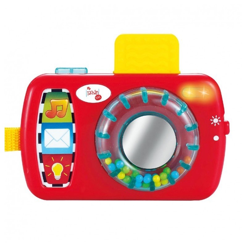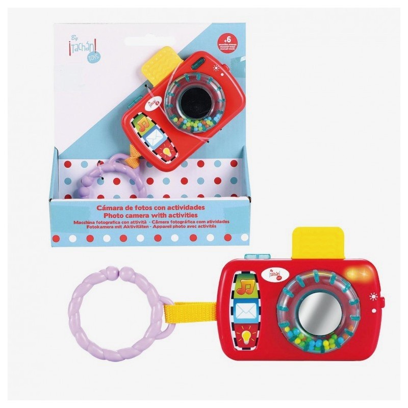 Edad recomendada: +6 meses. La primera cámara fotográfica para bebés con actividades, sonidos y melodías que incorpora un mordedor para calmar las molestias de los bebés durante la dentición. Entre los sonidos incluye 10 melodías diferentes y 3 efectos de risas alegres. Nuestra cámara de fotos para bebés contiene 3 botones, así como una ruleta con bolitas de colores y botón de encendido y apagado. Se trata de un artículo que estimula los sentidos del bebé y su capacidad de relación y coordinación ojo y mano. Sus colores brillantes y su tamaño perfecto para los más pequeños lo convertirán en su juguete favorito.