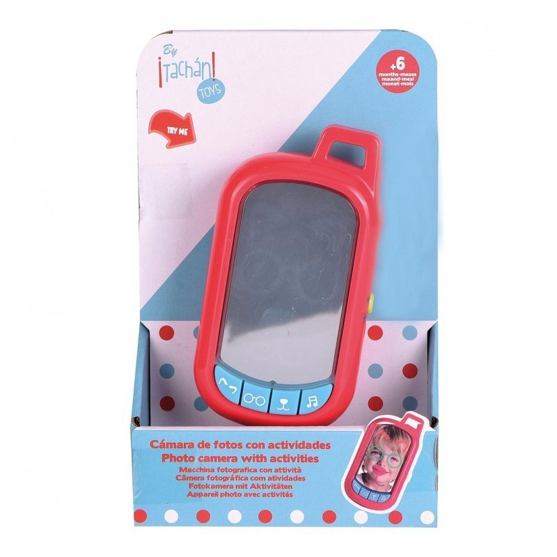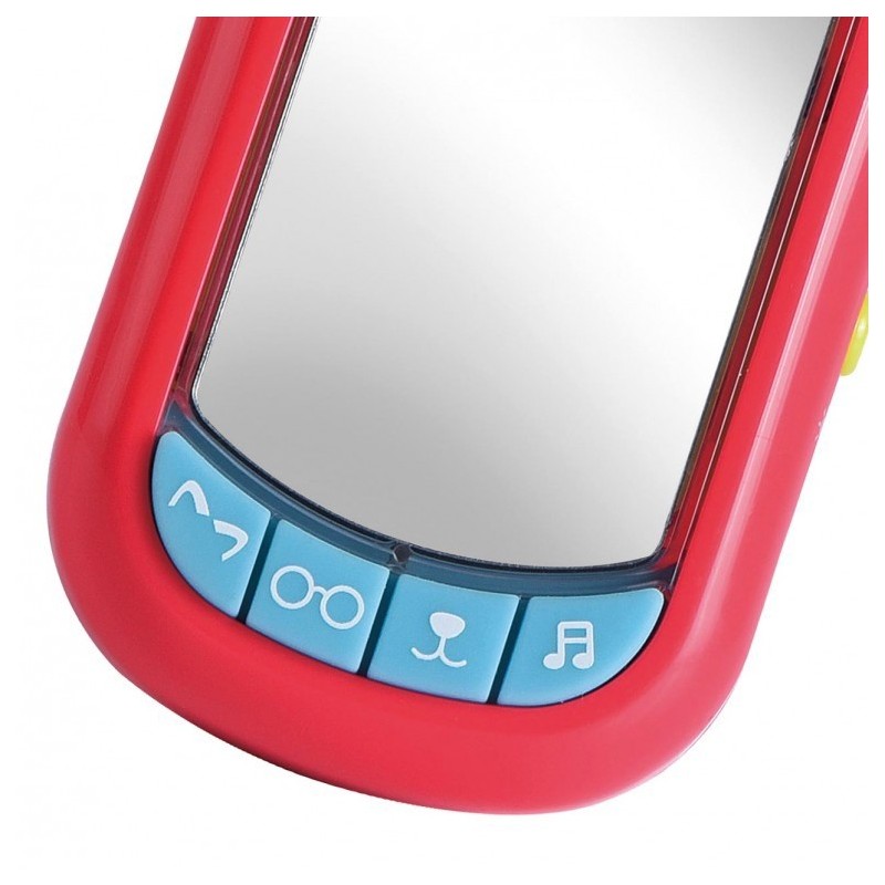 Edad recomendada: +6 meses. Teléfono sencillo, de intuición visual para los bebés con un espejo en el que aparecen filtros con nariz de perro, orejas de gato y gafas y donde los niños al verse reflejados se divierten con estos accesorios. Incluye 7 melodías y sonidos diferentes en sus 4 botones. También tiene botón de encendido y apagado. Funciona con 3 pilas de tipo AAA que vienen incluidas.