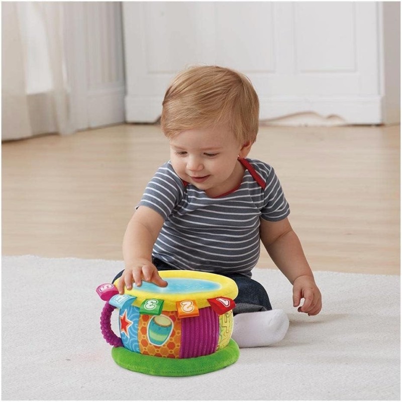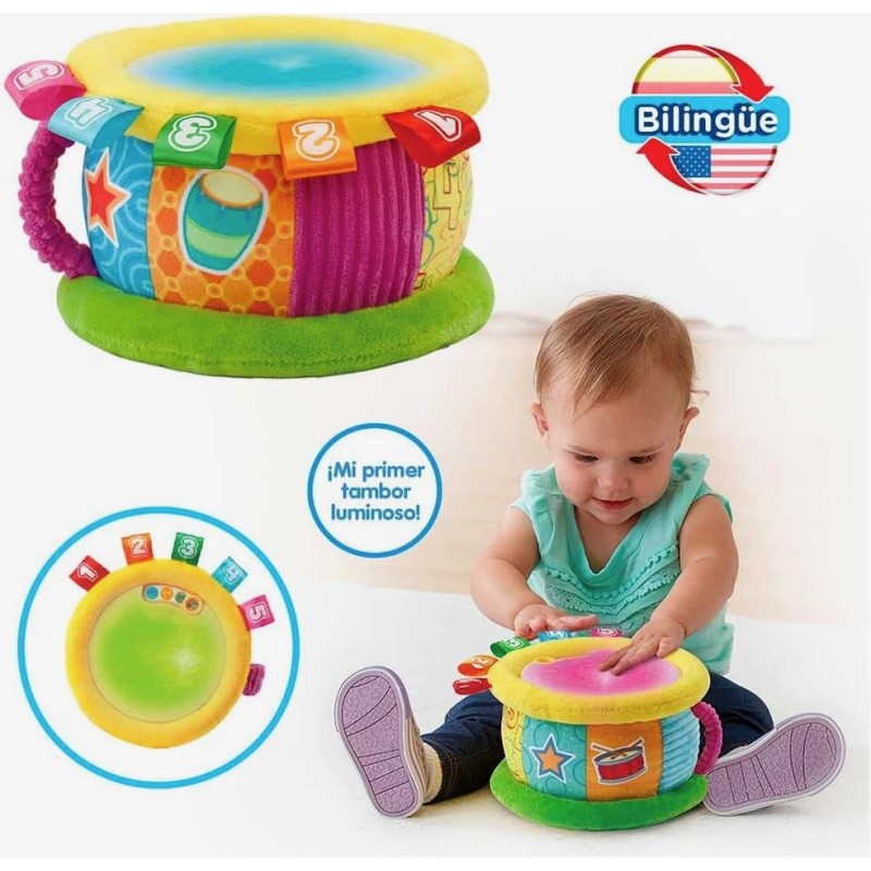 Edad recomendada: +6 meses. BILINGÜE: Selector de juegos e idioma para descubrir números y colores en español e inglés. IDEAL PARA BEBÉS: Divertido tambor luminoso. Gracias a su combinación de suave tela y plástico que hace de un juguete ideal para bebés. ACTIVIDADES: ¡Música a golpe de tambor! Verás qué divertido es tocar este tambor. Cada vez que lo golpea, su superficie se ilumina con diferentes colores y aprenderá sus nombres y los números. LLÉVATELO A TODAS PARTES: Gracias a su asa de transporte podrás llevártelo allá donde quieras. Desconexión automática para ahorrar pilas. REGALO IDEAL: Para los más pequeños de la casa, incluye más de 100 canciones, melodías, sonidos y frases. Cuando el bebé golpea el tambor se escuchan melodías y luces. Tiras de tela para estimular su desarrollo táctil.