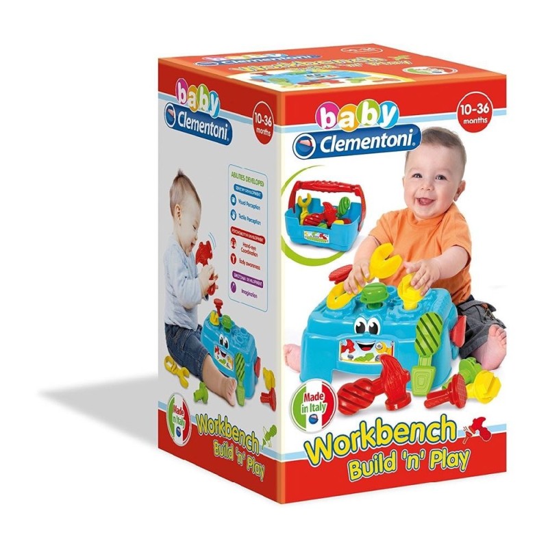 Banco de trabajo para jugar con 3 herramientas: un martillo, un destornillador y una llave inglesa También con 6 accesorios, clavos y tuercas, para una diversión completa e interactiva Desarrolla la imaginación y creatividad Dimensiones de la caja: 38 x 18 x 6 cm Edad recomendada: entre 10 y 36 meses