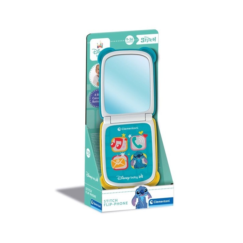 Edad recomendada: +9 meses. Tamaño de caja (AxPxA) 10 x 22 x 5.5cm. ¡Un móvil plegable personalizado con Stitch! Con 4 botones luminosos y un pequeño espejo para simular videollamadas. Un juguete de imitación para jugar a llamar por teléfono como mamá o papá. Juguete apto para niños a partir de 9 meses. ¡Descubre todos los juguetes de imitación con licencia Disney de Clementoni! Producto disponible en versión Mickey, Minnie y Stitch.