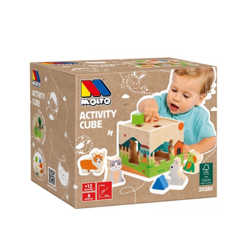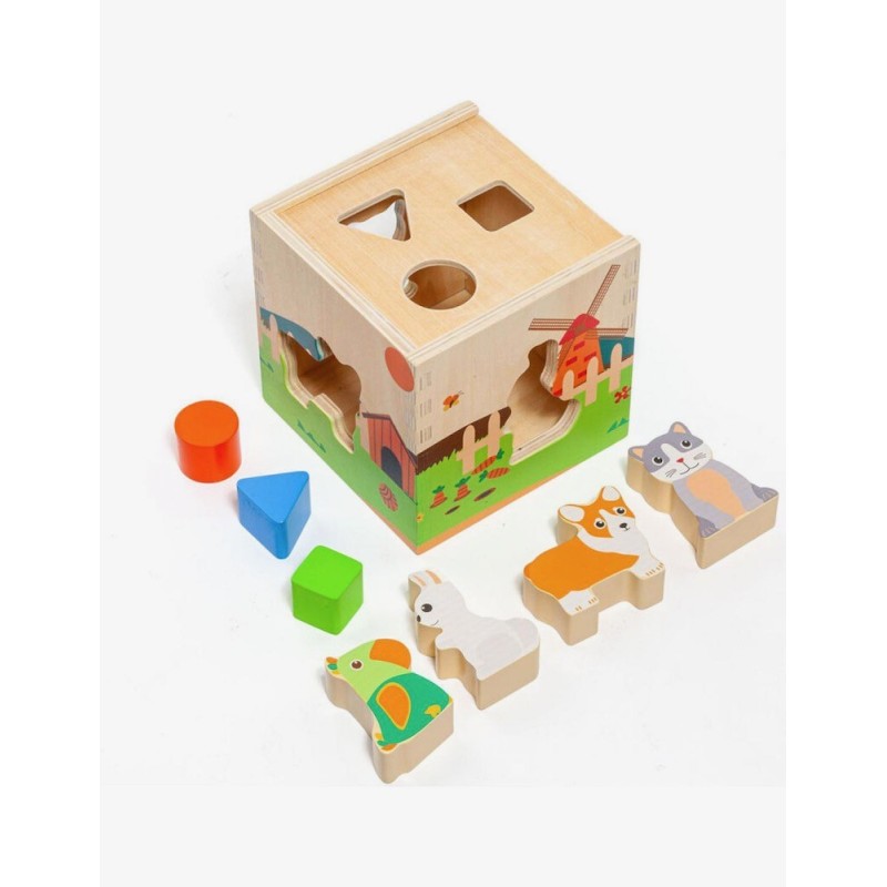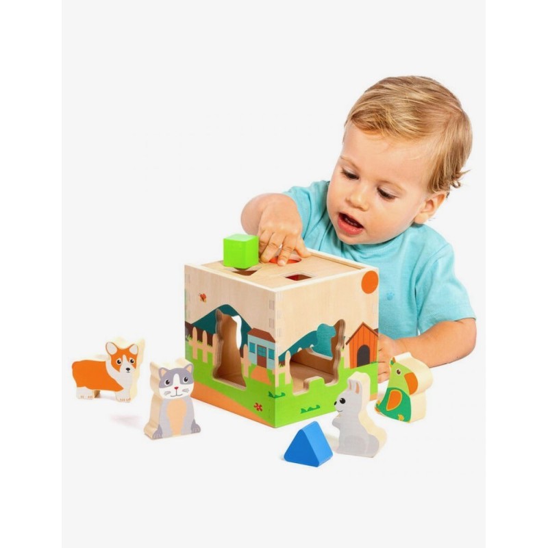 Cubo de actividades de madera con 4 animales, perro, gato, conejo y un loro, más 3 figuras geométricas para encajar y jugar ayudando a mejorar la motricidad. Tamaño: 16x15x26cm. Edad: 12 meses.