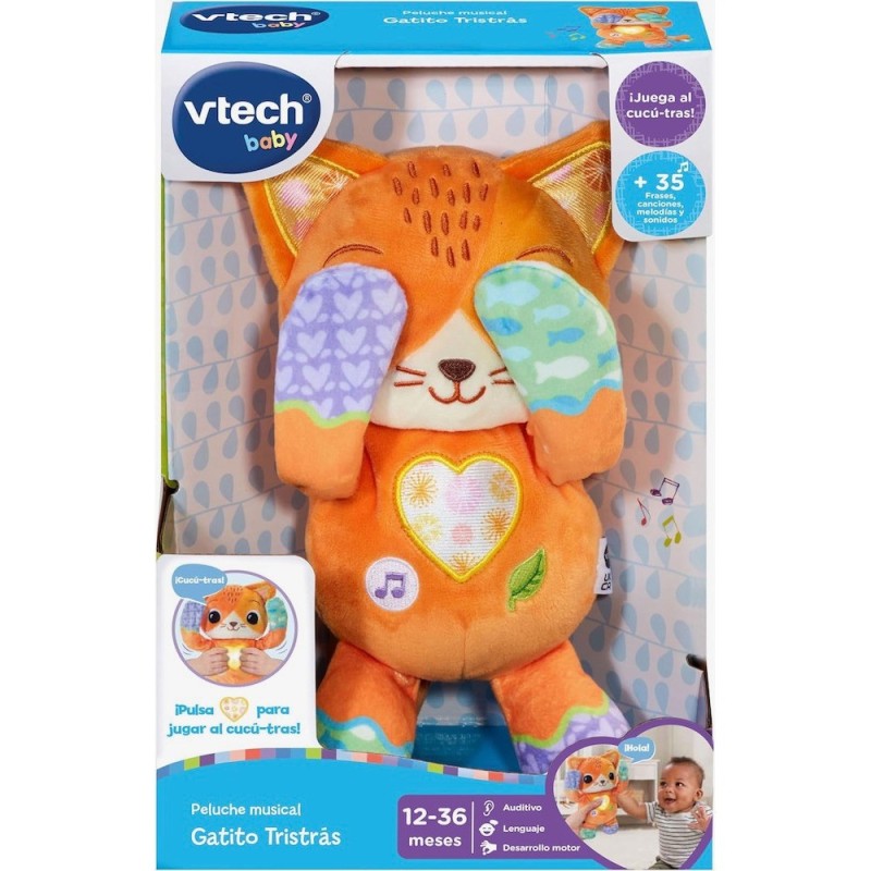 Edad recomendada: +12 meses. Simpático gatito de peluche para bebés +12 meses. Juega al cucú-tras con el bebé. Juguete con un diseño muy resistente. ¡Juguemos a cucú-tras con este adorable gatito! Pulsa su botón de corazón para hacer que se tape y destape los ojos, simulando cucú-tras, diviértete y aprende con sus divertidas frases y canciones y relájate con sus sonidos de la naturaleza. - CORAZÓN LUMINOSO: Al pulsar y soltar el botón de corazón, el gatito se tapará los ojos y se quitará las manos de los ojos, imitando el juego del cucú-tras y dirá frases relacionadas con ello. - BOTÓN DE HOJA: Incluye un botón en su tripita con forma de hoja para escuchar relajantes sonidos de la naturaleza. BOTÓN MUSICAL que activa divertidas canciones y melodías, y al pulsar de nuevo el botón mientras suenan hará divertidos sonidos. - EXPLORA TEXTURAS: Desarrolla el sentido del tacto con su suave tela y sus cintas. Más de 35 frases, canciones, melodías y sonidos.