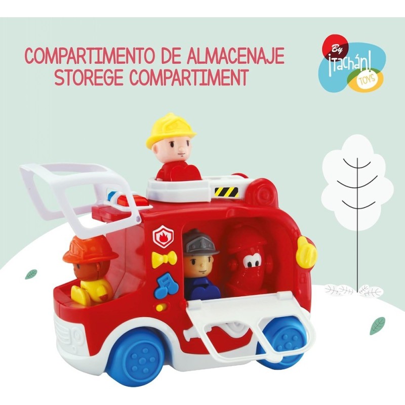 Edad recomendada: +12 meses. Se trata de un camión de bomberos con luces y sonidos. Incluye 3 personajes y una divertida salida de agua. El camión posee un compartimento para guardar cosas, asi como la cabina del conductor y una escalera elevadiza. Puede realizar hasta 15 sonidos y melodías diferentes.