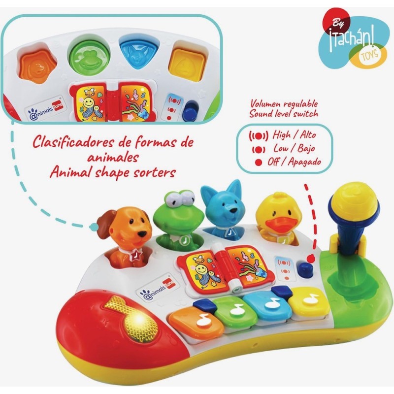 Edad recomendada: +12 meses. Medidas: 37 x 17 x 8 centímetros. MY FIRST PIANO. Piano musical primera infancia con 15 melodías diferentes y 4 animalitos Pop up. Se divertirán a la vez que les aportará beneficios cognitivos, emocionales y sociales esenciales para el crecimiento y el aprendizaje de los pequeños. DISEÑO ANIMADO. Presenta un diseño muy animado, con colores vistosos y formas que captarán por completo la atención del niño ofreciéndole tiempo de diversión y de aprendizaje. ALTA CALIDAD Y SEGURIDAD. El piano de Tachan está fabricado pesando en la seguridad y comodidad de los más pequeños. Todos los artículos pasan los controles de seguridad exigidos por ley. Alta calidad y durabilidad. INCLUYE 4 personajes de animales que se moverán al ritmo de la música y podrán jugar con ellos ya que se sacan del piano . Además incorpora un micrófono para poder cantar mientras tocan. Regulador de volumen y 4 teclas con sonidos.