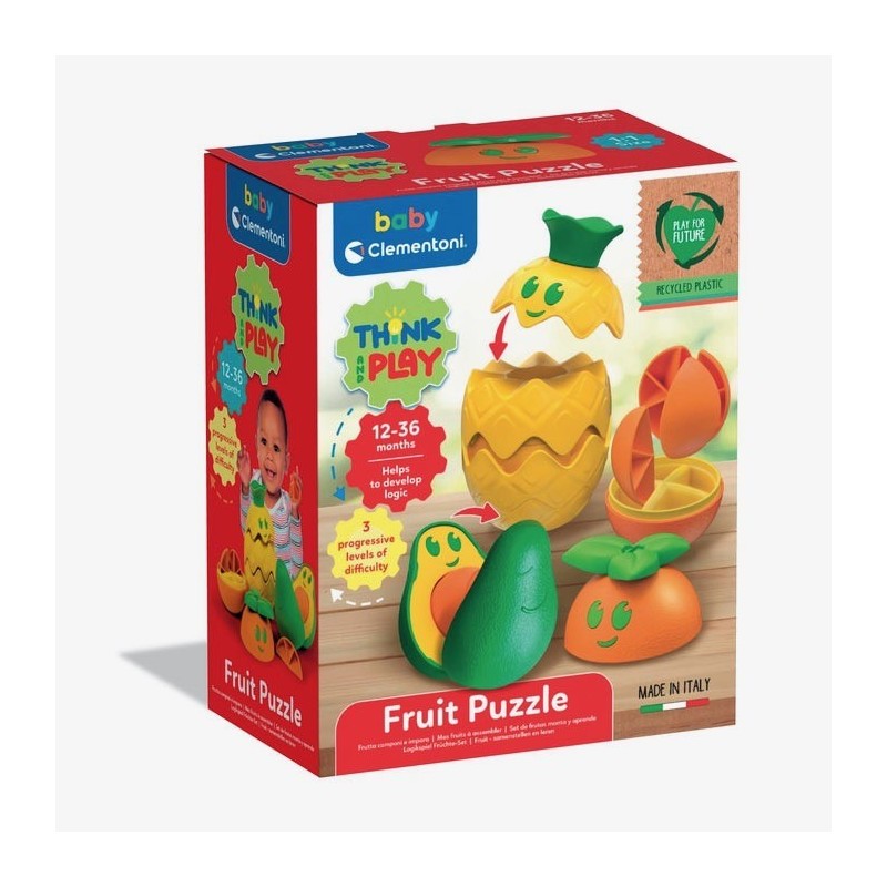 Edad recomendada: +12 meses. ¡Tres coloridas frutas de plástico reciclado para nutrir la mente y estimular la lógica de los más pequeños! Un diseño refinado y Made in Italy para un juguete de calidad y ecosostenible. Componer las frutas estimula la lógica con diferentes tipos de juegos de dificultad creciente, para acompañar a los niños en su crecimiento y favorecer el desarrollo de sus habilidades. El aguacate se abre y esconde una bola que se puede quitar y volver a poner. La piña está formada por elementos que se pueden apilar. La naranja se abre y esconde 4 rodajas para sacar y poner. Cada fruta permite realizar diferentes ejercicios manuales y experiencias sensoriales gracias a las texturas.