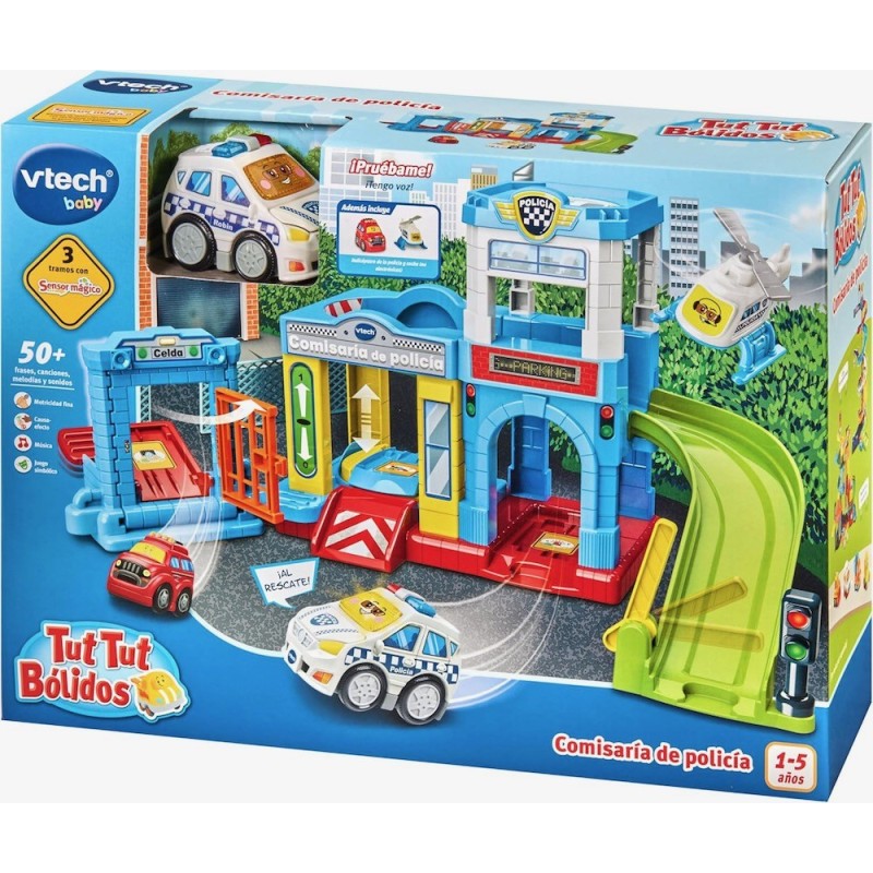 Edad recomendada: +12 m. Circuito interactivo, Playsets y coches de juguete para niños +1 año. ¡LA POLICÍA A TU SERVICIO! ¡Al rescate! Si oyes sirenas y ves luces, es la policía ¡listos para ayudar! Sube el coche de policía por el ascensor hacia la rampa de salida y prepara el helicóptero... ¡vamos de camino! CARACTERÍSTICAS: Varios escenarios y elementos para manipular que recrean una comisaría de policía: celda, helipuerto, rampa de salida, aparcamiento, ascensor con giro que para en dos pisos y lanzador. DIFERENTES COMBINACIONES: Une la Comisaría de policía junto a otros playsets de la gama Tut Tut Bólidos y crea ¡un escenario increíble! 6 Sensores mágicos: Los Tut Tut Bólidos responden con diferentes frases, canciones y sonidos cuando pasan por los sensores mágicos (de venta por separado).