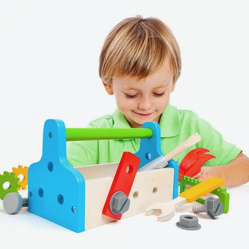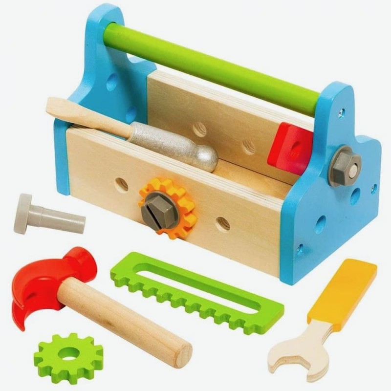 Caja de herramientas de madera Tool Box Molto Esta caja de herramientas de madera incluye todo tipo de accesorios: tuercas, tornillos, martillo, destornillador y llave inglesa. Con ellas podrá enroscar, desenroscar, y meter y sacar las piezas. Todos los accesorios van a en una práctica caja de madera para guardar y transportar todas tus herramientas. Este juguete de madera pertenece a la colección Molto Nature, lo que significa que está fabricado con madera proveniente de una gestión forestal apropiada, socialmente beneficiosa y económicamente viable de los bosques del mundo. Características: Ayuda al desarrollo de la coordinación y la imaginación del niño, y también de su psicomotricidad. Está pintado a mano, con colores a base de agua no tóxicos Cumple con las mas estrictas normas de seguridad. El set íntegro incluye 14 piezas en total. Medidas: 12,5 x 23,5 x 14,5 cm. Edad recomendada: +18 meses.