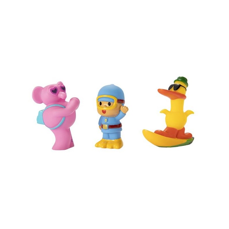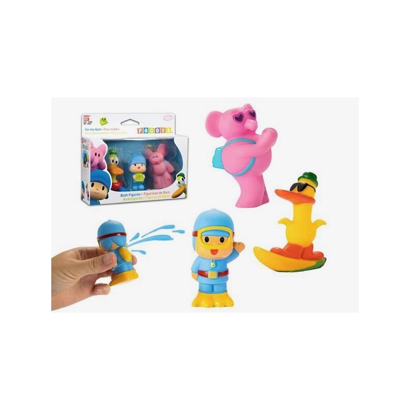 Pack de 3 figuras de Baño Pocoyó Incluye figuras de Pocoyó, Pato y Elly Las figuras de Pocoyó flotan en el agua Las figuras de Pocoyó y sus amigos tiene el tamaño perfecto para las manos de los más pequeños. Edad recomendada: +18 meses.
