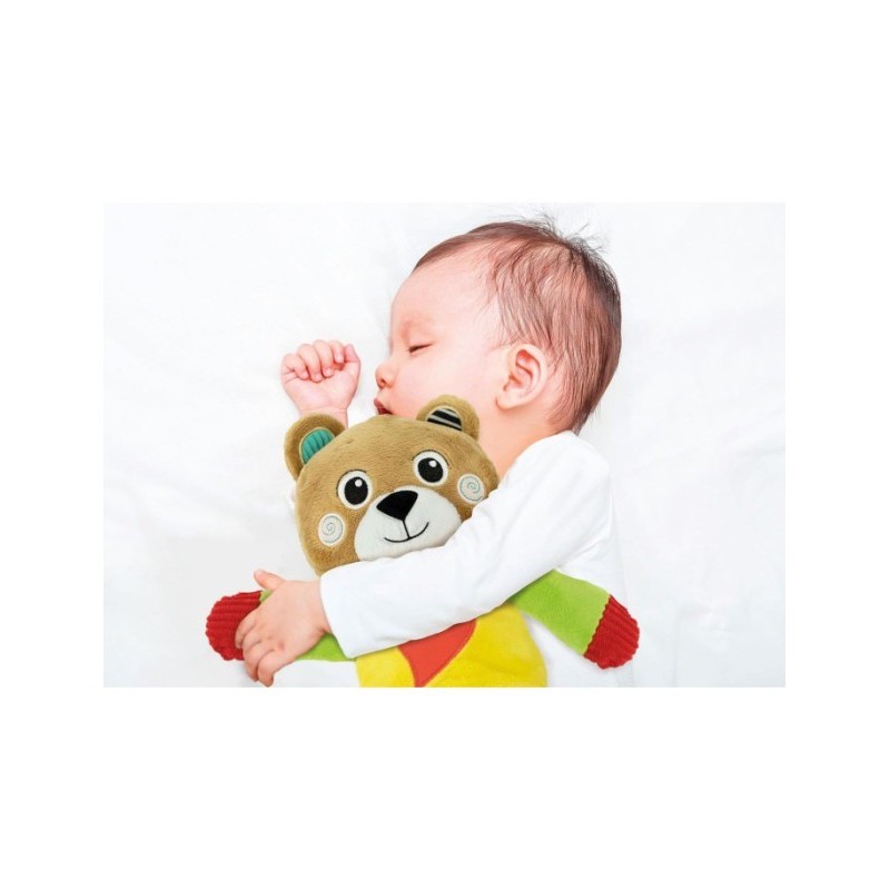 Un tierno osito de peluche que se convertirá inmediatamente en un amigo inseparable de los más pequeños desde los primeros meses de vida. El peluche está fabricado con diferentes materiales para la estimulación multisensorial del pequeño y el desarrollo de la percepción táctil en las primeras etapas de la vida. El compañero perfecto para el desarrollo del bebé. El peluche lleva consigo una suave manta confortable, diseñada para absorber el olor de la madre y tranquilizar al bebé en la fase del desapego. Se puede lavar a máquina.