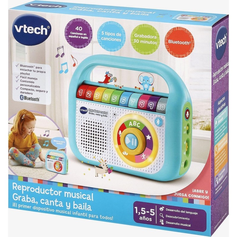 Medidas Caja: 14,8 x 17,5 x 6 cm. Edad recomendada: +18 meses. Reproductor musical graba, canta y baila ¡Primer reproductor musical infantil para educar el oído de los más pequeños! El reproductor musical infantil consta de 40 canciones incluidas, modo grabación y conexión Bluetooth para escuchar una lista infinita de canciones. Su fácil manejo y sus colores llamativos hacen de este juguete un aliado perfecto para favorecer el desarrollo musical del más pequeño. 40 canciones incluidas. 10 botones de colores para personalizar con una canción, historia o mensaje de boz. Conexión Bluetooth. 5 tipos de canciones. Grabadora de 30 minutos. VTech se preocupa por el planeta: En VTech trabajamos para reducir nuestro impacto medioambiental, como parte de un enfoque eco-responsable.