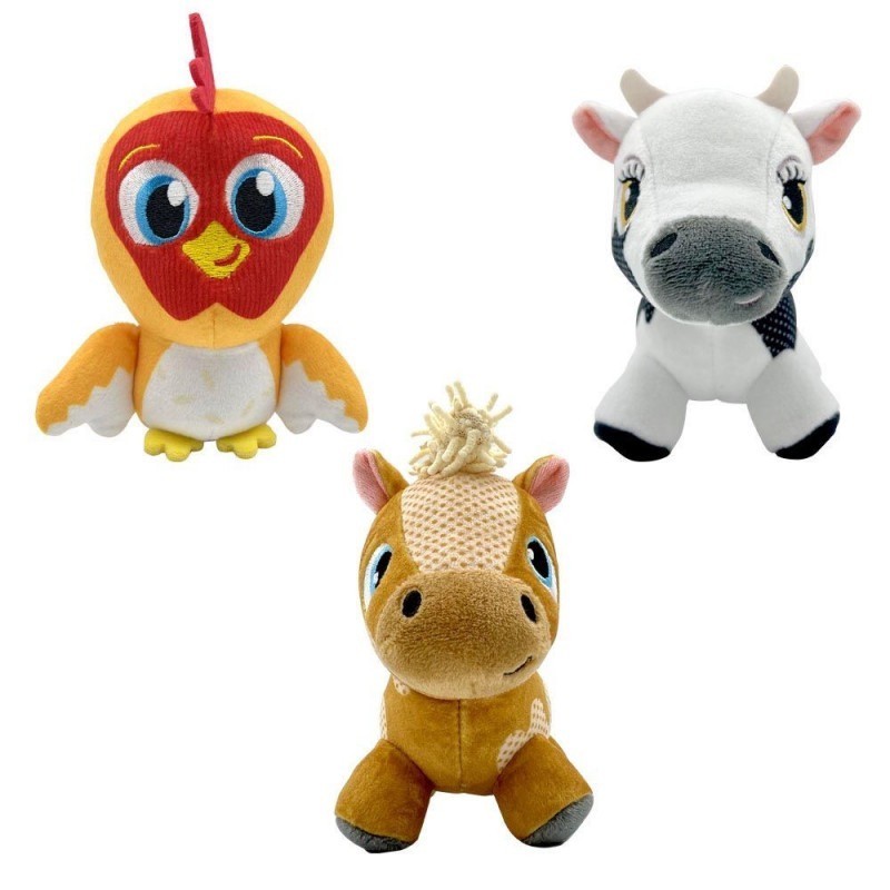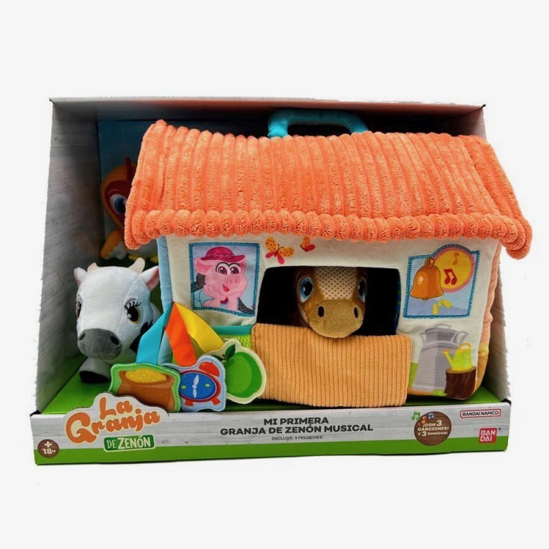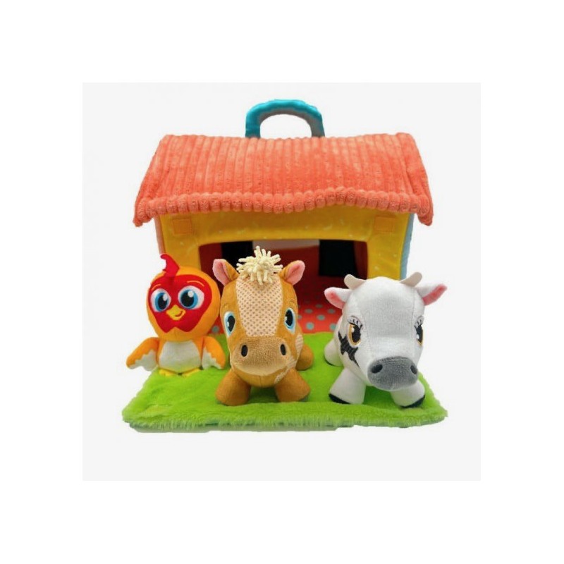 Edad recomendada: +18 meses. Granja maletín de Peluche con diferentes texturas y accesorios para no parar de jugar y recrear tus aventuras de La Granja. Incluye un asa para trasportar y, 3 Mini Peluches Musicales y con sonidos y música de La Vaca Lola, el Gallo Bartolito y el Caballo Percheron.
