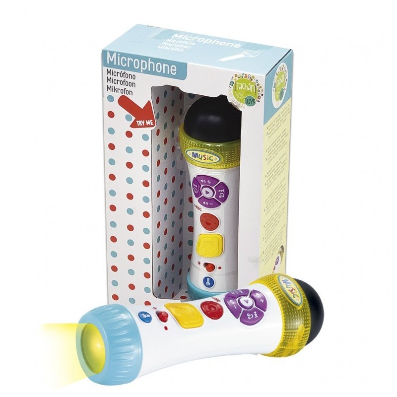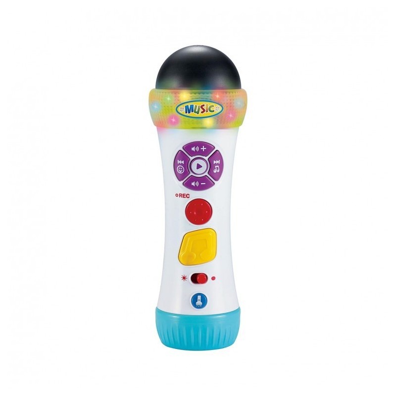 Edad recomendada: +18 meses. Micrófono para niños con diferentes efectos y melodías. Incluye luces parpadeantes multicolor - Control de Volumen - 8 efectos rítmicos - 18 melodías - Grabación de voz - Botón de Playback - 2 efectos con risas - 10 efectos de sonido - Apagado automático a los 50 seg. - Función de linterna. Desarrolla la creatividad de los niños.