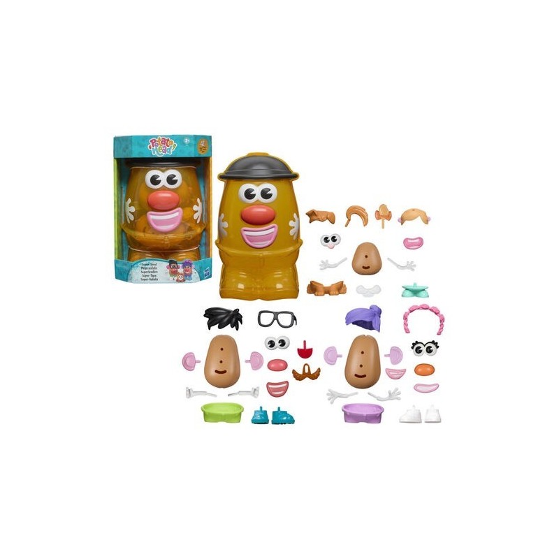 Edad recomendada: +2 años. Los pequeños se divertirán creando personajes y rostros con los 2 cuerpos de papa grandes, 1 cuerpo de papa pequeño y 38 partes y piezas que se pueden combinar para crear 2 padres además de un bebé papa o mascota! Al terminar de jugar, guarda todas las piezas juntas dentro del gran contenedor con forma de papa. Los accesorios son compatibles con la mayoría de los juguetes Potato Head.