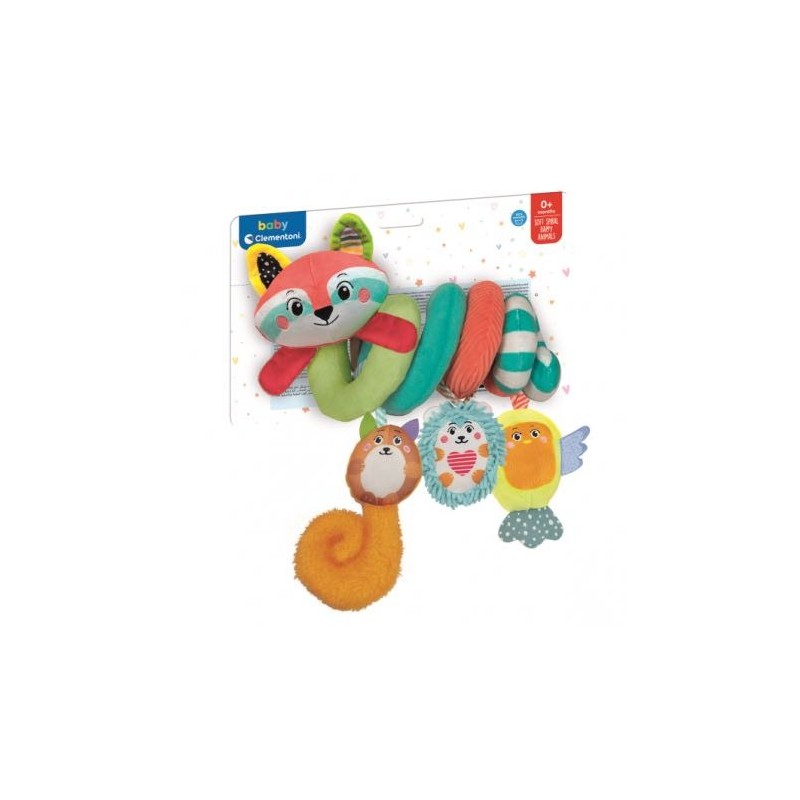 Edad: +0 meses Simpático mapache con amigos del bosque que forman un suave colgador en espiral, para entretener y divertir a tu peque gracias a los diferentes materiales y los sonajeros de los colgantes.