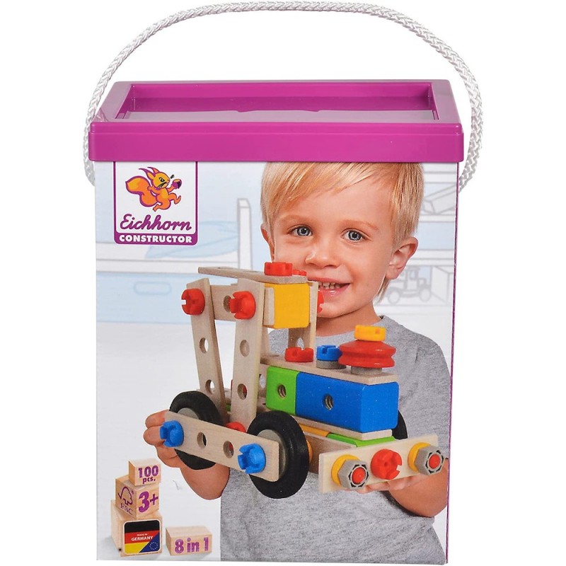 Bloques de madera en contenedor. Edad recomendada: +12 meses