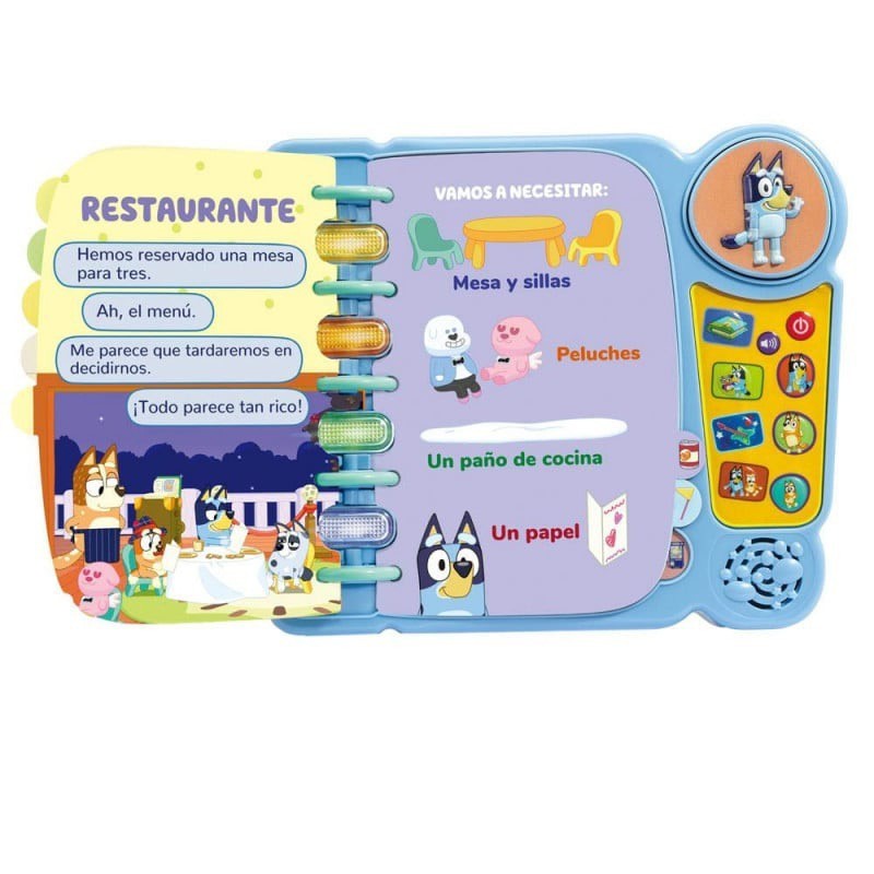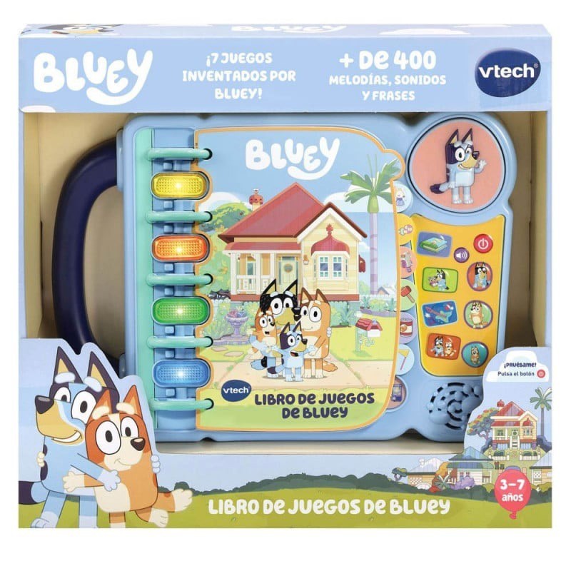 Medidas: 3 x 28,3 x 20,5 cm. Edad recomendada: +3 años. Pasa las páginas del libro para divertirte con los juegos inventados por Bluey y Bingo simulando acciones de la vida real. Juega con ellas en las 4 actividades del libro, toca sus botones ¡y descubre muchas sorpresas en cada página! - Incluye 4 modos de juego, 14 páginas ilustradas y la portada, 4 grandes botones de colores con luz y 4 botones de personajes, que junto a la voz de Bluey y Bingo acompañarán el juego en todo momento para animar a los niños a aprender a leer mientras disfrutan con sus personajes favoritos. - ¡7 juegos interactivos de Bluey! Jugando con Bluey y Bingo, ¡Música!, ¡Sígueme!, Juegos de Bluey, Escucha a Bluey, Botones de familia y Botones de luces. - 4 botones para escuchar otras frases de sobre los personajes de la serie: Bluey, Bingo y sus padres. Voces originales de Bluey y Bingo. - Más de 400 melodías, frases y sonidos. - Aspectos educativos: Atención y memoria, Juegos de rol y Exploración y descubrimiento. - ¡Cuidemos del planeta! En VTech trabajamos para reducir nuestro impacto medioambiental, como parte de un enfoque eco-responsable.