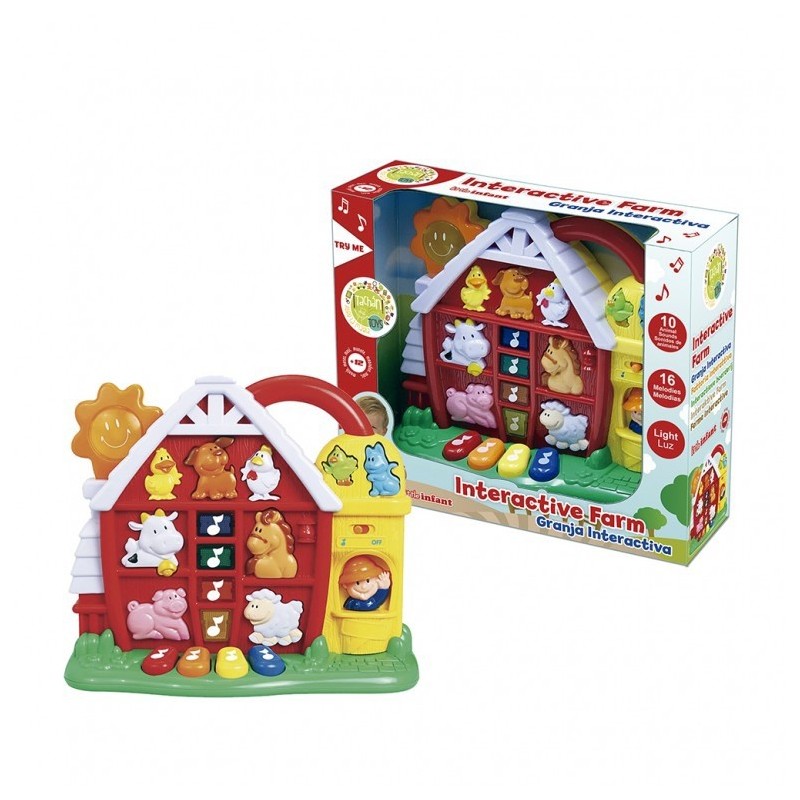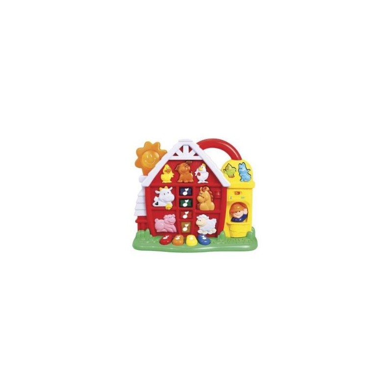 Edad recomendada: +3 años. Con 9 sonidos de animales, perro, pollo, gallo, pájaro, gato, cerdito, vaca, cordero y pato y el sonido del granjero. 4 teclas para sonidos musicales. Pulsa una de las 16 melodías y al pulsar un animal este cantará con la música. Funciona con pilas, incluidas.