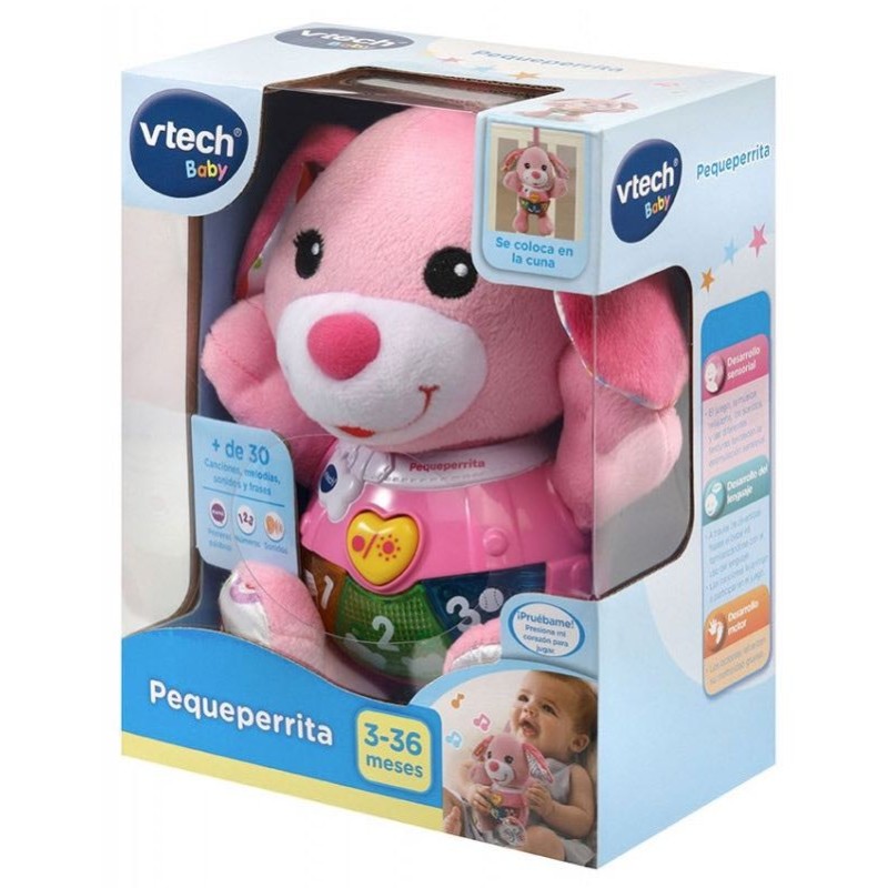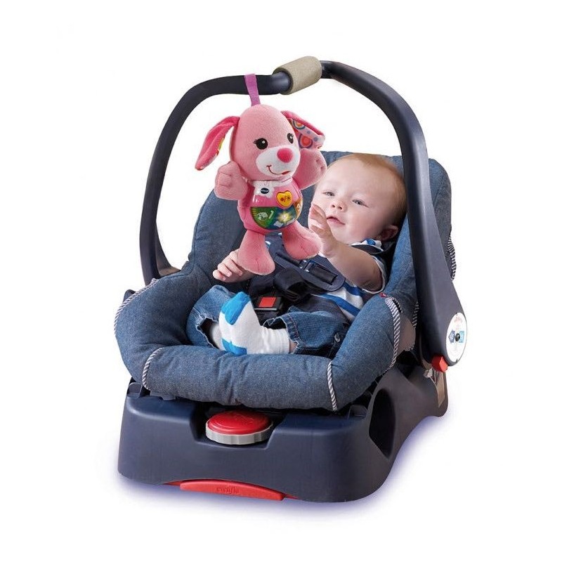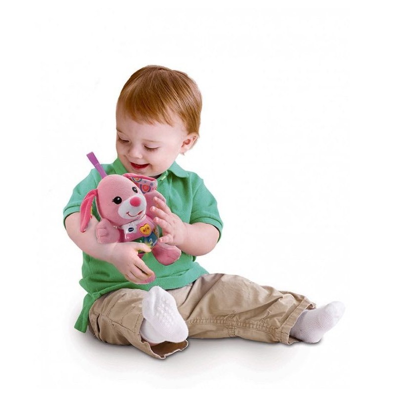 ¡Perrita con voz y melodías! Suave perrito de peluche color rosa. Enseña números, objetos y puedes escuchar suaves melodías. Tira de velcro para colgar en la cuna, la silla o el carrito. Tiene 3 botones luminosos. Edad recomendada: entre 3 y 24 meses.