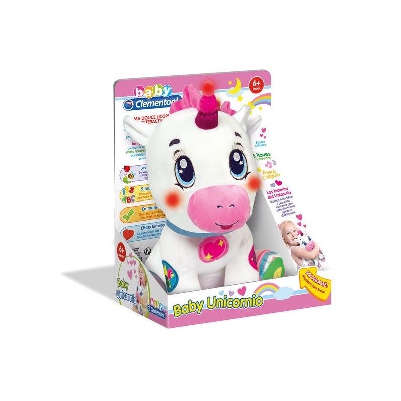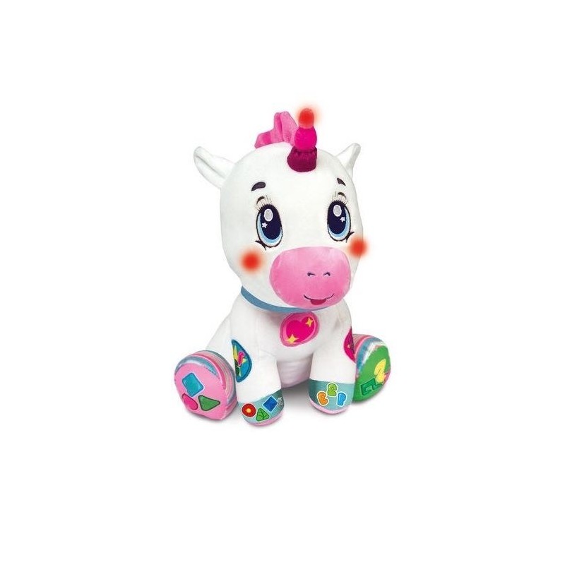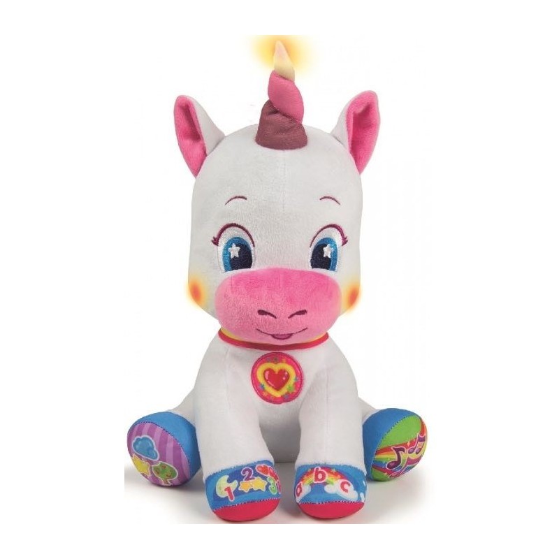 Adorable Unicornio con efecto luminoso. Pequeñas canciones y muchas rimas felices para aprender nuevas palabras divirtiéndose. ¡Todo un mundo de juegos, con este unicornio de peluche interactivo! El pequeño y dulce unicornio entretendrá a los niños con sus efectos sonoros y luminosos. Juntos descubrirán las primeras letras y números de forma sencilla y divertida .Funciona con 2 Pilas LR3 (No incluidas). Edad recomendada: +6 meses.