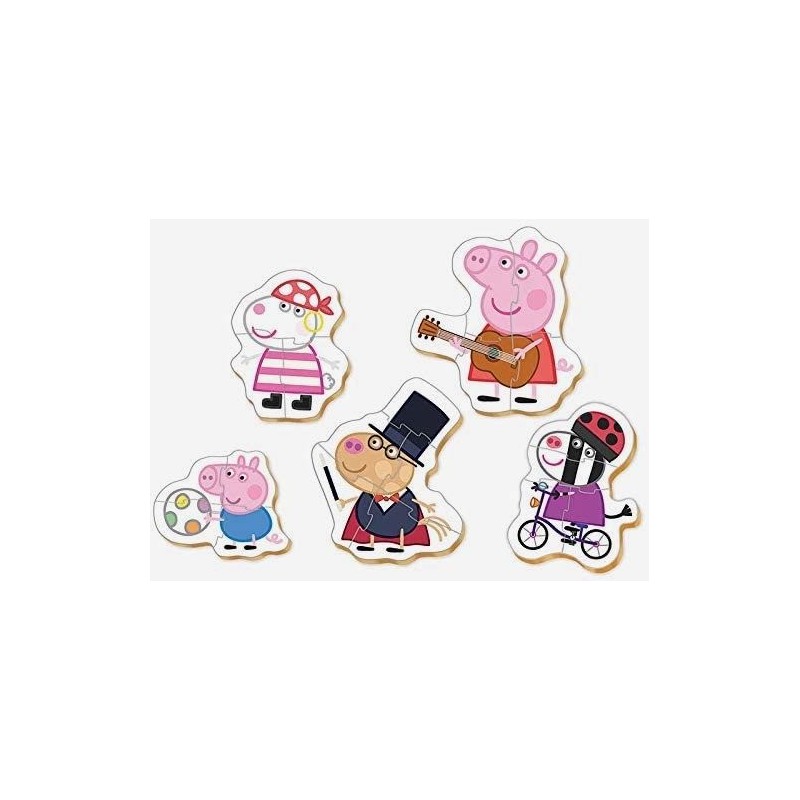 Baby puzzles de peppa pig con cinco puzzles de 3 a 5 piezas con los principales personajes del dibujo animado: peppa, george, susy, zoe y pedro; compuestos por grandes piezas, perfectamente acabadas para que sea sencilla y segura su manipulación por los niños; el puzzle desarrolla la fijación de la atención, así como el desarrollo de la psicomotricidad, la curiosidad e imaginación de los más pequeños. Edad recomendada: +2 años.