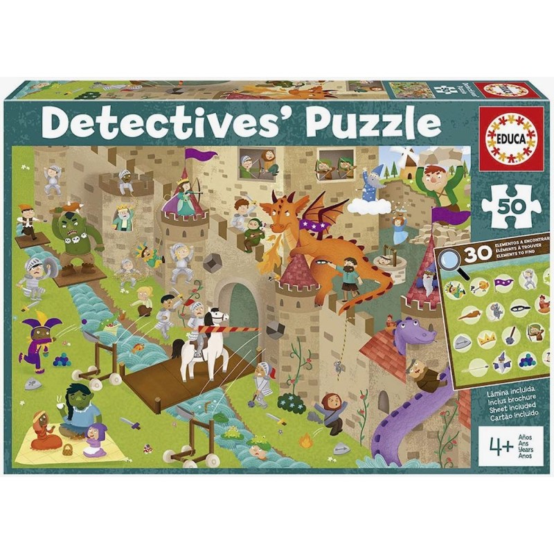 Puzle de 50 piezas de dimensiones 40 x 28 cm. Ensambla el puzle y encuentra los 30 elementos ocultos. Incluye una hoja a color con las ilustraciones de los 30 elementos a encontrar. Temática: La Ciudad. Los Detectives' puzzles son diversión asegurada. Primero, monta el puzzle, luego encuentra los 30 objetos escondidos. Incluye una lámina con los 30 objetos a encontrar en esta divertida imagen de un castillo medieval lleno de princesas, caballeros, dragones y soldados. El puzzle tiene 50 piezas y una vez montado mide aproximadamente 48 x 28 cm. edad recomendada: +4 años.